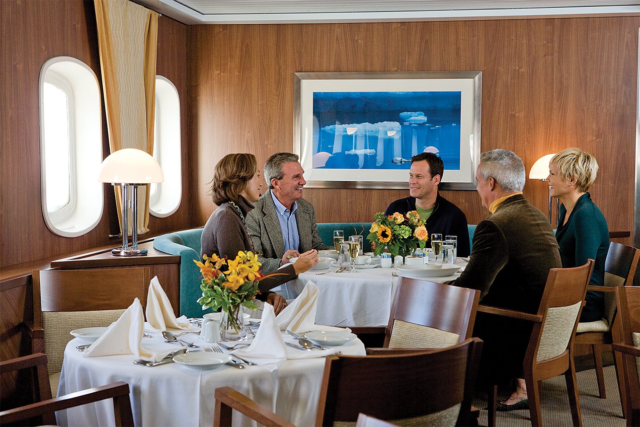 Meals are served in the dining room, Bistro bar, or the Observation lounge, at a single seating with unassigned tables for an informal atmosphere and easy mingling. Menus feature sustainable choices, local where possible.