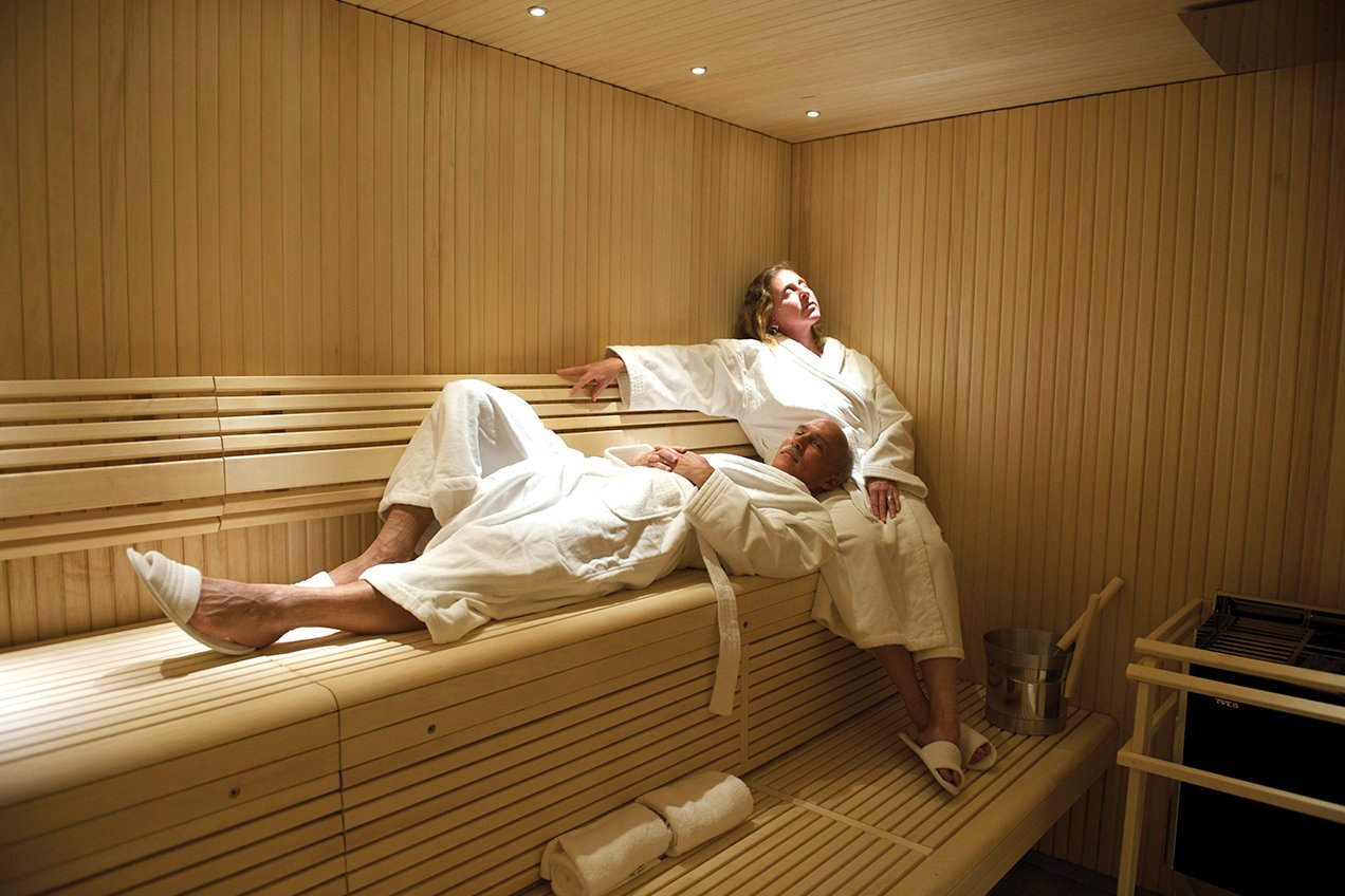 A glass-enclosed fitness center, outdoor stretching area, a LEXspa treatment room and sauna, staffed by wellness specialists.