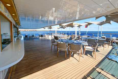 The Upper Deck features an outdoor shower, whirlpool hot tub with adjacent shaded seating area and a windowed fitness center and spa perfect for relaxing. The outdoor café on the Lounge Deck can accommodate all guests in a single seating.