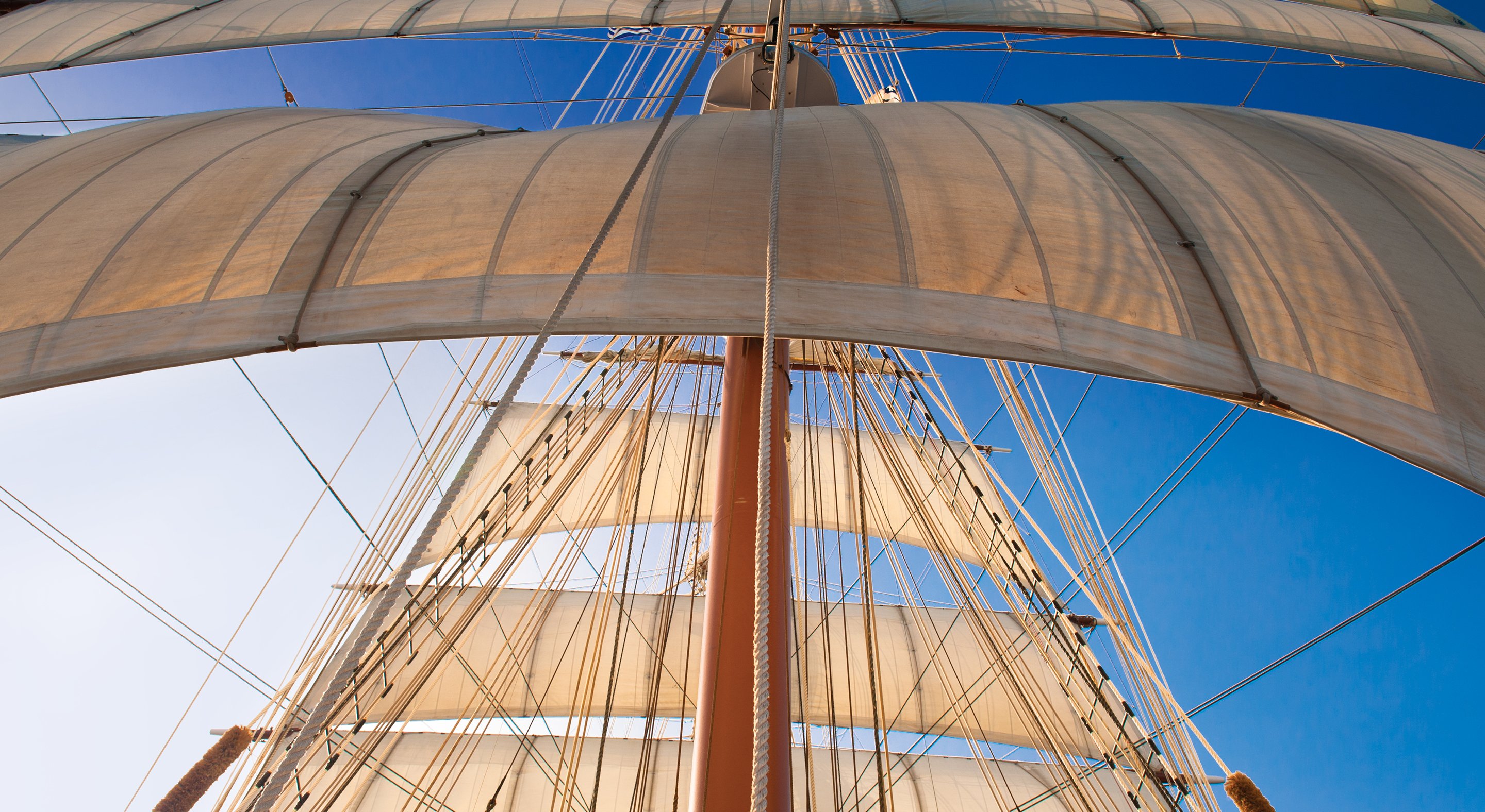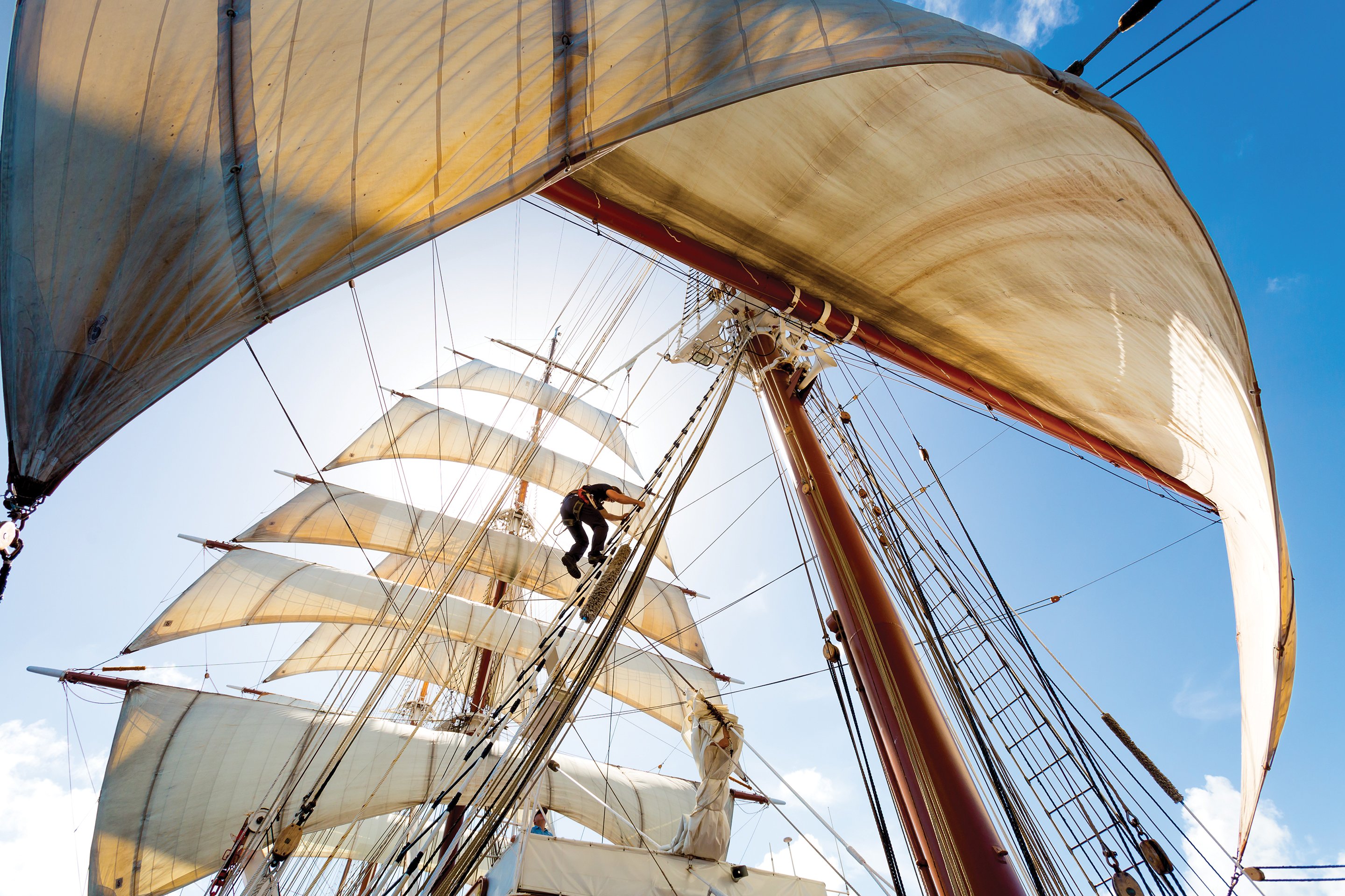 Experience the thrill of voyaging under sail on _Sea Cloud II_, watching an orchestrated frenzy of crew members going aloft in the web of riggings to hand-set 23 sails