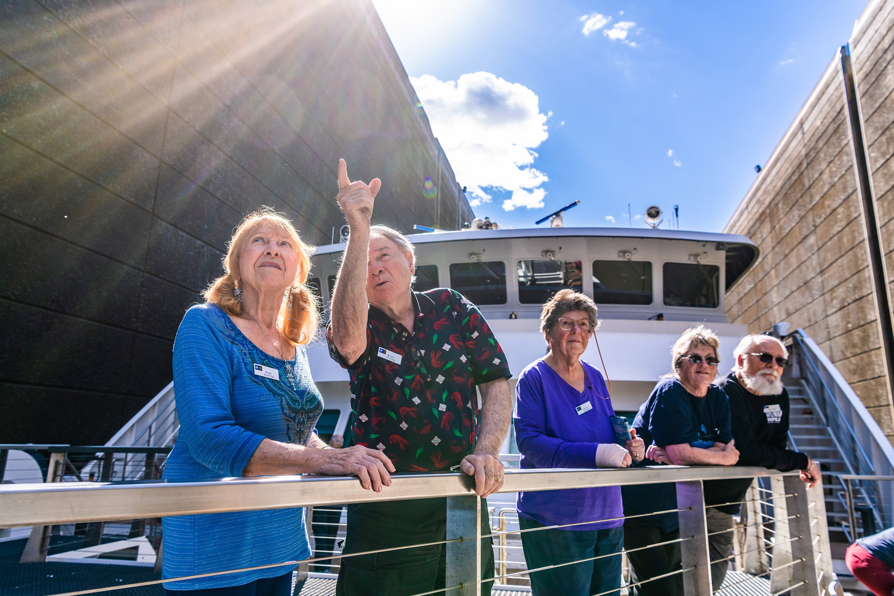 Unseasonably warm and dry weather continued to grace us as we proceeded with our expedition down the Columbia River. The morning was crisp as we disembarked in Hood River, Oregon, but quickly warmed up as we boarded our coaches. Our explorations began at Multnomah Falls, the number one tourist attraction in the state of Oregon. After we experienced this astounding cascade, some of our guests proceeded to Beacon Rock for a scenic climb up this 800-foot tall, aged lava plug. Others went to the Bonneville Fish Hatchery where we visited a local icon, Herman the sturgeon. Then both groups of explorers met at the Columbia Gorge Interpretative Center for Syncline wines and an overflowing helping of intriguing local history. As the superb weather continued, we voyaged back to National Geographic Sea Bird for a lovely afternoon of classic cruising down the Columbia River. Guests enjoyed the sun on deck or an engaging presentation on how climate change is affecting migratory birds. Complimentary water-level views of Multnomah Falls followed, and our last transit through a lock of this trip – a lovely passage through the Bonneville Lock and Dam. Photos by Doug Crispin and Alex Rubenstein