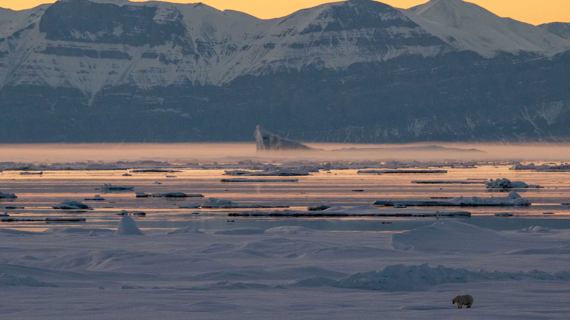 We stayed overnight along the ice floe with our bear from last night, and he was obviously hunting. He was still there at sunrise, patiently guarding the breathing holes of the seals.