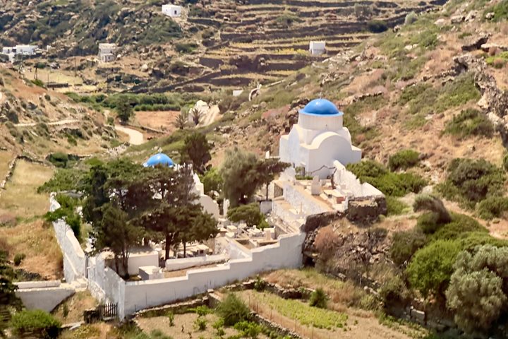 The Cycladean island of Sifnos is one of those rare and special places that seem to embody the essential nature of some beautiful ideal, in this case that of the quintessential Greek island rising from the blue Aegean. Steep cliffs of sparkling schist embrace quiet harbors, while tucked into the hills above are many small villages of brilliantly whitewashed buildings and tiny blue-domed churches. As is the case with the Church of the Seven Martyrs, which we visited this morning, these are often built on rocky promontories, accessible only by long steep staircases that climb the cliffs behind them. Bright bougainvillea, shady little cafés, friendly Greek shopkeepers and the cats basking in the sun everywhere you look make this lovely island exactly what travelers to Greece see in their imaginations when dreaming of the journey to come.
