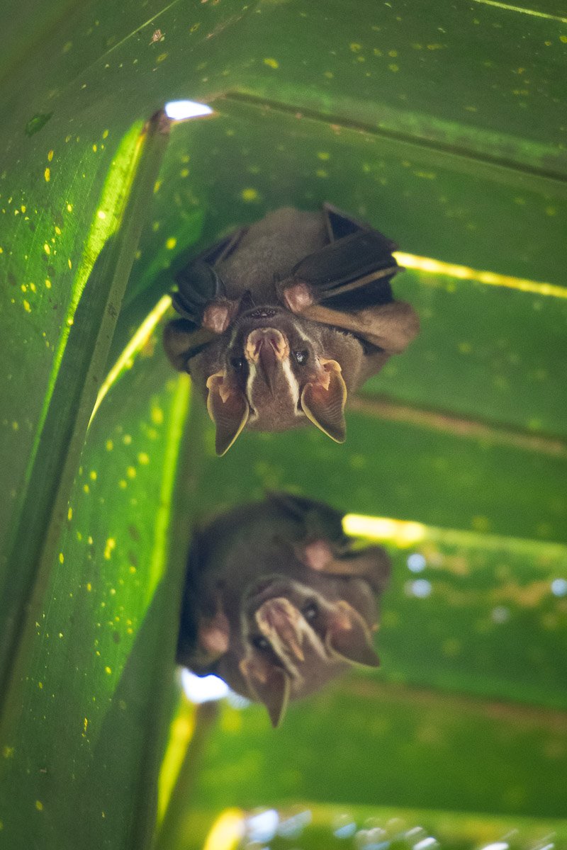 Tamandua! The cry went out from our naturalist Jorge early this morning on our skiff ride on Belluda Creek. We craned our necks and adjusted our viewpoints to see this arboreal anteater as it quietly went about the business of gathering its breakfast. Finally, it stepped into a clearing on a branch right over our heads! He seemed to be posing for our cameras, so we quickly took many images for posterity. Tamandua paparazzi! After being delayed for a short time due to a torrential downpour, we set out in our skiffs once again to explore the Dorado River — this time into the darkness of night! Our intended quarries were the wily caimans on the river; their positions in the complete darkness were revealed by the shining of their eyes under our strong spotlights. These youngsters allowed us to get right next to them as they floated on vegetation, just waiting to strike at a fish or other prey!