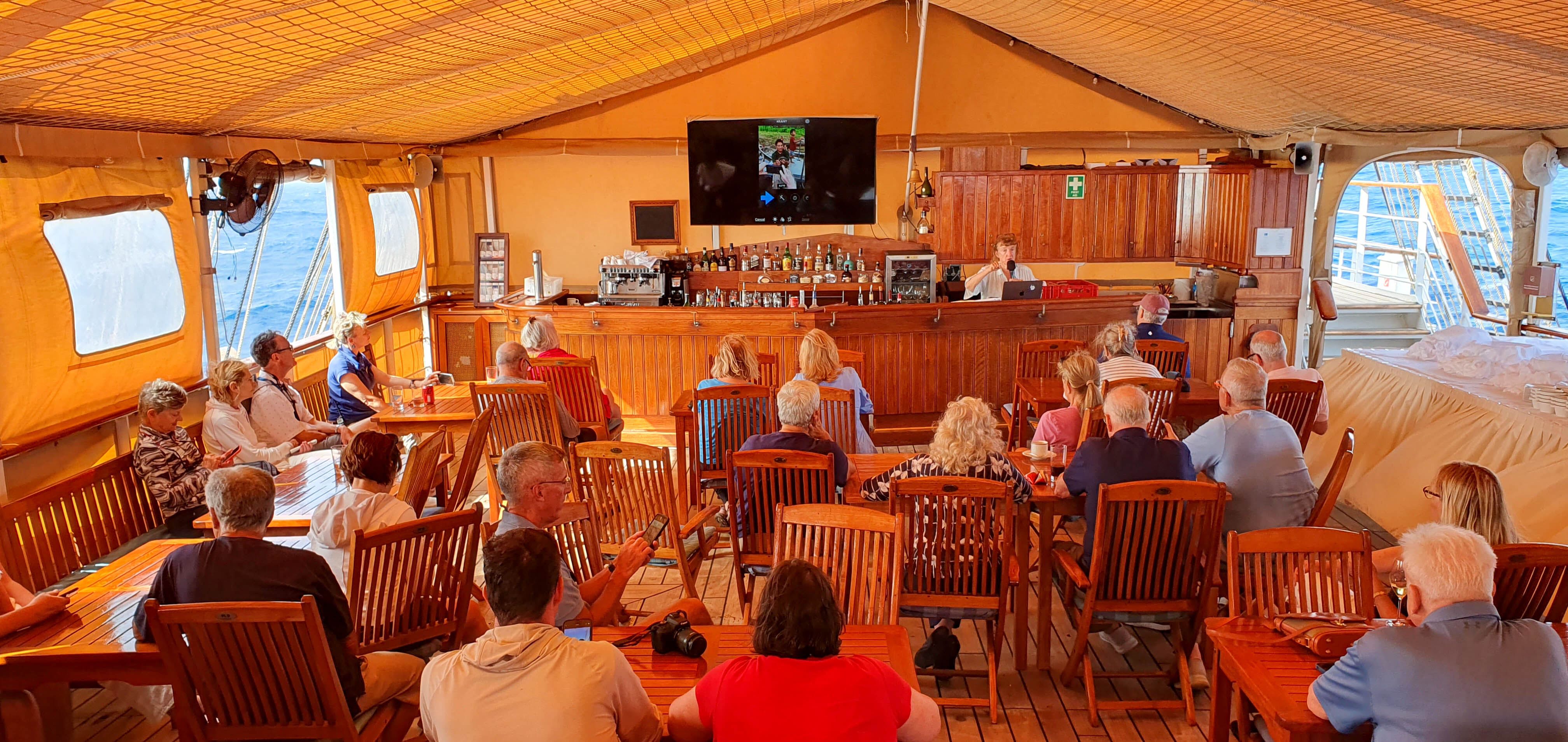 We are getting to the end of an amazing week exploring the Upper Amazon aboard the Delfin II. It has been an astonishing trip in many ways. This morning, we explored the Marañon River. We disembarked on the riverbank of the Amazon Natural Park, a protected area where the primary forest is full of birds and wildlife. Three small catamarans took us around the lake. We paddled slowly and observed the fauna. Once in the jungle, we walked for about two hours to explore this emerald world where trees cover the sky and light doesn’t reach the ground. Inside, it was dark. Plants struggle with each other for photosynthesis, some strangling their neighbors to survive. We observed the birds that live in dark areas. Thanks to evolution, they are sensitive to sunlight. The capped manakin is a very small, interesting creature. They feed on fruits and make mechanical sounds that are not vocals; rather, the sounds come from their wings. They have special, modified feathers that produce the sound.