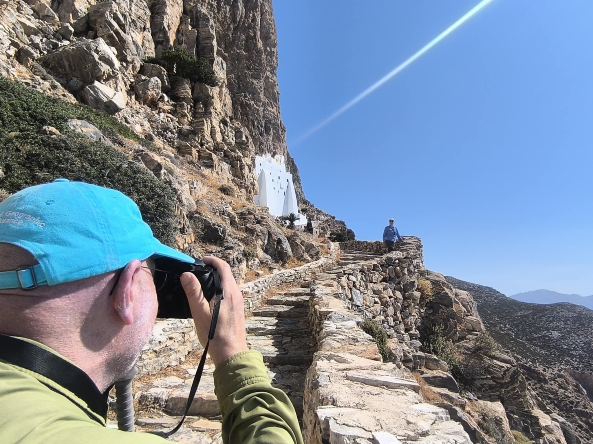 On this windy day, Sea Cloud threw anchor in the protected port of Katapola, where we boarded the coaches and started the scenic drive up the switchbacks to the eastern shores of the island. There we climbed more than 300 stairs to the thousand years old Monastery of Hozoviotissa, which is carved inside cliffs right above the Aegean Sea. The Virgin Mary’s icon is considered holy by the islanders. After this “pilgrimage,” our next stop was the island’s biggest chora (town) with a population of about 400. We took a short tour and had some independent exploration time to enjoy little cafes, shops, and mazelike alleys. We greeted locals: humans and cats. Some of the explorers went back to Katapola a little early for a swim in the crystal-clear blue waters of this Cyclades gem of an island.