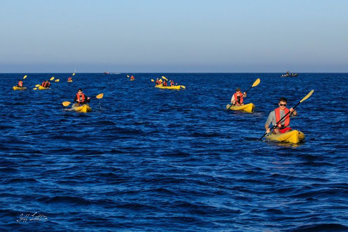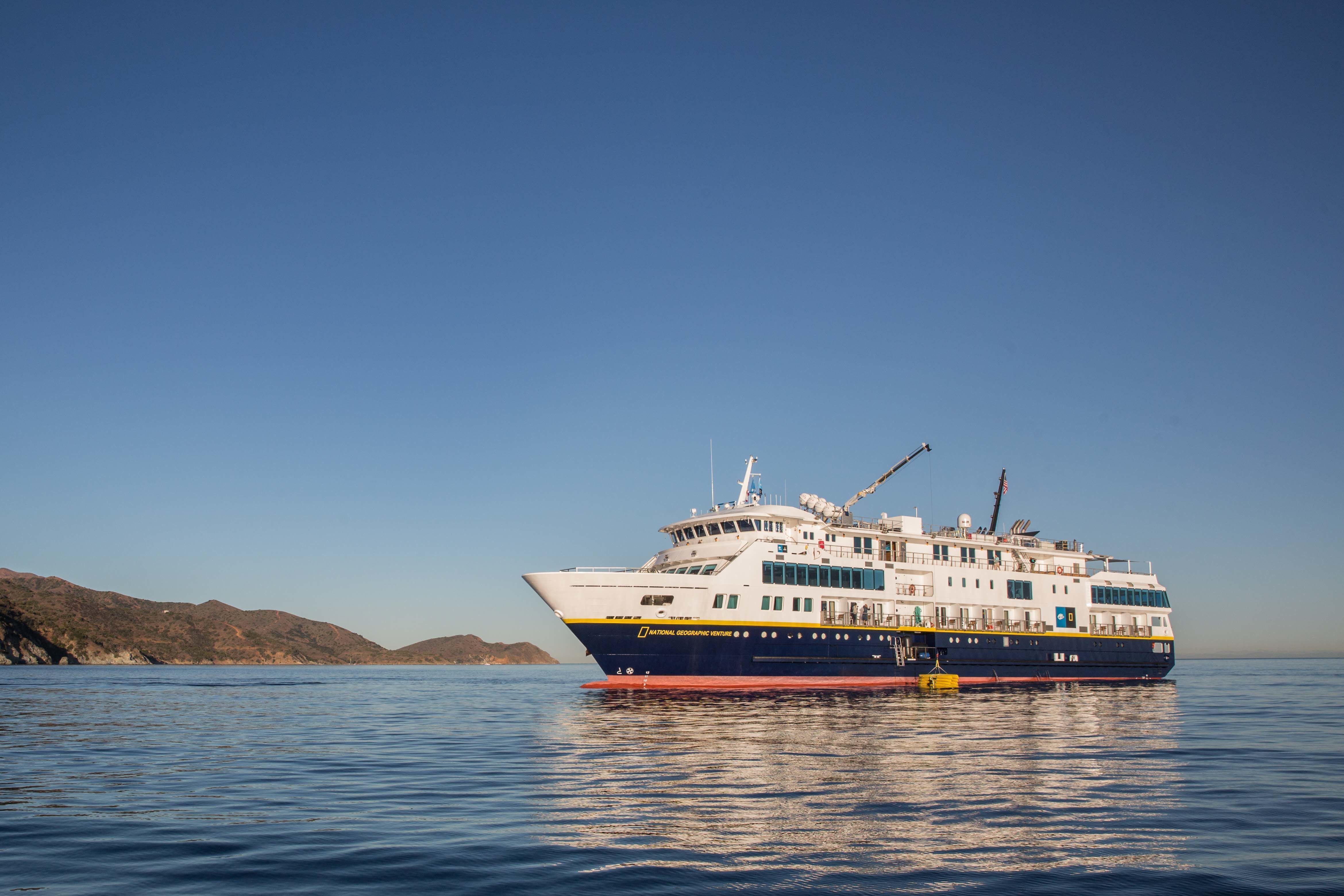 We departed the dock in San Pedro and sailed into the soft evening light and weather, with the lights of the Los Angles metropolis in the background. After a gentle night crossing of the San Pedro Channel, we awoke to an absolutely perfect day at Two Harbors, Catalina Island. No wind. No clouds. Bright blue sky. Flat seas. A perfect set of conditions for the morning’s activities than included a fast and far hike, a moderate hike, kayaking, paddleboarding, and Zodiac cruising. Those who embarked on the hikes were treated to spectacular vistas, as well as challenges to leg muscles. Those on the water, especially those who went around Bird Rock, saw two sea lions at the surface with flippers extended into the air and sun as little solar heating panels, which warmed the circulating blood before returning and warming their bodies. And of course they did what many of us do when lying in the sun…doze. Once every few minutes a head would poke up to check out the scene, then back to the nap. Hundreds of cormorants sat like miniature sentinels on the rock, all facing the same direction, some drying out their wings after spending some time in the water. Interspersed among the cormorants were a handful of pelicans, including one out of place male who was in full breeding colors. All “dressed up,” but no one was interested because he was a few months too late! Some of the kayakers saw an adult leopard shark, a benign species that pays no attention to humans. In the water (and on the beach) were hundreds of pyrosoma , cone-shaped, colonial tunicates that normally inhabit deeper and colder water, but were probably uplifted to the surface by localized upwelling. And there were signs of giant kelp returning to the area after warm waters of the last El Ni ñ o. After returning to National Geographic Venture , we were treated to an exquisite brunch, followed by deserts on the sun deck. Whale watching Santa Catalina recede slowly into the distance the realization became firm: This was indeed a perfect day in every respect.