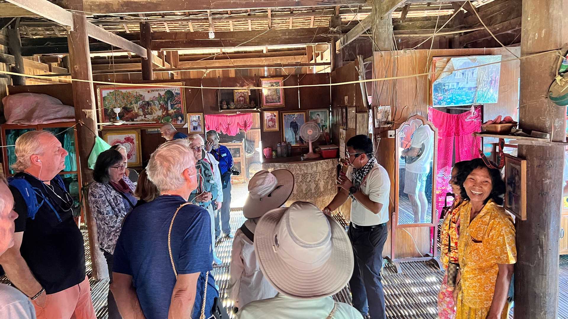 As the warm Cambodian sun rose over the mighty Mekong River, Jahan eased up to the riverbank at Angkor Ban just 15 kilometers from Phnom Penh. After breakfast, guests departed the ship to roam around Angkor Ban, a traditional Khmer village bustling with vegetable markets and beautiful vernacular architecture. Khmer guides led guests around the village, entering a traditional house while engaging with local children and residents. After returning to Jahan, local monks came aboard to chant in Pali and give a blessing to guests continuing their voyage.