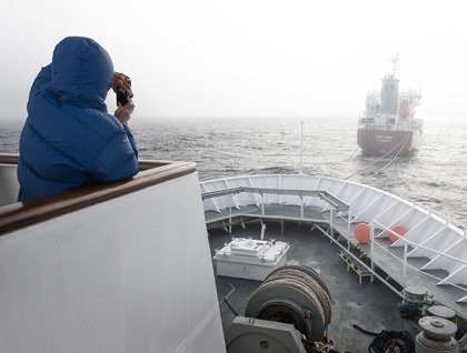 Our symbiotic rendezvous now complete, the polymeric umbilical was ‘cut.’ The daylong, low churn turned to a rhythmic hum as our speed increased and focus once more renewed. Oratank peeled off and disappeared into the haze. Our unflinching vaporous companion began to steadily fall behind, at first slowly then in large clumps, as if exhausted and now unable to keep pace with our freshly fueled vessel. Mountaintops soon emerged from the fog’s cloak, affording our first look at mighty Baffin Island, our quarry for the next few days.