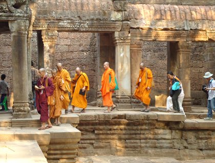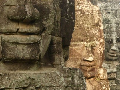 Our minds are jumbled. The time for farewells has arrived and yet there is more to explore. Our thoughts are cluttered with questions, with new images yet to be synthesized and complicated concepts to be understood. We do not complain about our confusion for this is why we venture to the far corners of the earth. We collect ideas, sift and sort and, in time, see everything in a different light. The morning light is golden and the anticipation of sunrise shook us from our beds in the early hours. The cool breeze would soon be lost and we were not the only ones afield. School children in their blue-and-white uniforms energetically pedaled bicycles past as we sat enthroned in comfort in shaded chariots (tuk-tuks) pulled by motorbikes. Devas and asuras guarded the gates to Angkor Thom as they have done for generations, still churning the sea of milk. Inside the narrow gates, families of macaques dashed about as if they too needed to deliver their progeny to some unknown site. It takes time to see the order in the chaos of Bayon. From a distance the lichen painted sandstone seemed all in disarray. Giant blocks with fragments of figures waited like a massive jigsaw puzzle yet to be tackled and solved. With each passing moment, little-by-little, fragments fell into place. Four roads converged. Bayon is the center of Angkor Thom. The orientation does make sense. Two concentric galleries in a compact rectangle tell the history of the past. Bas-reliefs, as intricate or maybe even more so than those of Angkor Wat, record the lives of the people from a thousand years ago. A military procession, a naval battle, the flora and fauna of the time are all recorded here for those who take the time to stop and look. Faces stared back. No corner or direction could be found where the bodisattva could not see us. Fifty-four towers with four faces each, watch in the each of the cardinal directions. Nearby elephants paraded along the walls of the Terrace of the Elephants, while sportsman etched in stone played the same game they have done for centuries. The maze of the Terrace of the Leper King hid intricate carvings too. Time passed too rapidly and now the time has come to scatter in all directions. Our expedition has come to an end but our search for knowledge continues.
