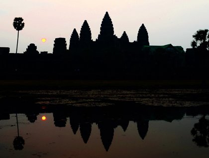At 8:30 a.m., we bade a fond, even tearful, farewell to Jahan and her magnificent crew, led by the competent Captain Quy as well as the hospitality staff, under the superb General Manager Win Min. On our five-hour bus ride to Siem Reap, we passed a rapidly growing number of rubber plantations, which are becoming a major element in the economy of Kampong Cham province. It has been found that natural rubber, the product of these plantations, has once again become competitive, due to the increased cost of petroleum products and, more importantly, because the natural product is better for certain applications. Our Trails of Indochina guides joined us for this last leg of our Mekong journey, which will culminate in our visit to the Angkor temples. Sometime after noon, we arrived at the luxurious La Résidence d’Angkor, where we were warmly welcomed and provided an excellent buffet lunch before being assigned to our boutique accommodations. This luxury “boutique” hotel is just ten years old and is a most congenial base for our explorations over the next couple of days. Our first introduction to the classic Angkor ruins was Ta Prohm, a monastery built by the Buddhist King Jayavarman VII and dedicated to his mother. We learned that, after his time, it was dedicated by his Hindu successors to the god Brahma. The four heads of Buddha (or Brahma) that adorn the entrances to all of Jayavarman’s many religious structures, welcomed us — in this case, they had been uncovered fairly recently by the removal of trees that had covered them for centuries. Indeed, amid the clearing of forest growth and reconstruction that has taken place over the previous 100 and more years, Ta Prohm remains unique because of the interdependence of the sandstone and laterite that went into its construction and the variety of large and invasive trees and vines that literally hold it together. It is a marvel, richly engraved with imagery that is easily identified with either Hinduism or Buddhism; every corner unveils new images and new mysteries. This is a wonderful way to begin our all-too-brief adventure among the temples of Angkor. We regrouped in the evening to enjoy a “barbecue” in the lovely gardens of our hotel, overlooking the pool. We retired early in anticipation of a 5 a.m. departure on the morrow to visit the centerpiece of the Angkor temples, the fabled Angkor Wat.