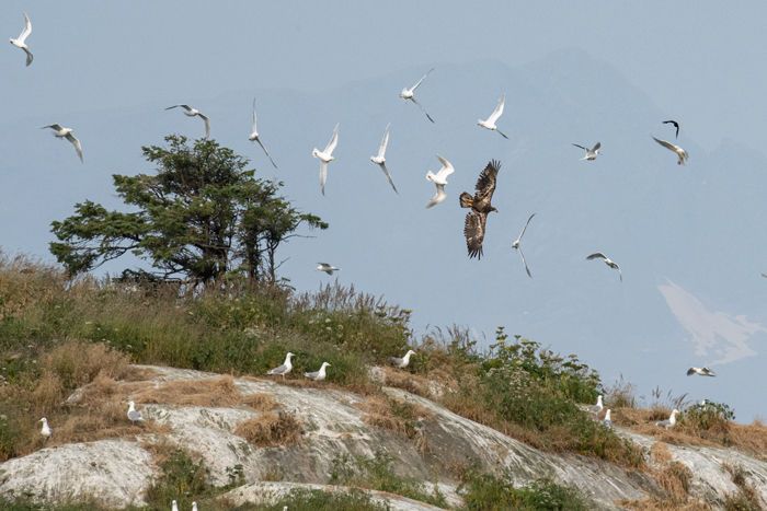 It was hard to believe that National Geographic Orion crossed the Bering Strait today as we re-entered US waters and said goodbye to Russian waters. We woke to calm seas, so flat it barely felt as though we were underway and not a typical day for this body of water that has long separated Russia from Alaska. As early as the mid-1500s geographers believed a body of water separated Asia from North America. Semyon Dezhnyov is thought to be the first explorer to cross the Bering Strait in 1648, but Danish born Russian explorer Vitus Bering was the first to cross and submit an official report to Europe almost 100 years later and whom the waterway is named for. During the Cold War, the Bering Strait marked the boundary between the Soviet Union and the United States and was known as the “Ice Curtain.” Indigenous peoples were prevented from transiting between the two nearby continents for seasonal trade and celebrations and there was no commercial air or ship traffic allowed. Back on July 30, we sailed across the International Date Line in route to Russia and in the early morning hours today we passed over it once again. This means that we enjoyed a second August 10th on board and took advantage of our relaxing day at sea. In the morning Naturalist Grace Winer presented “Nome: Gold Rush on the Bering Sea” and fellow guest Dave Weeshoff shared stories and insight on his time spent volunteering with International Bird Rescue. Our day was filled with the exchange of images captured throughout our three weeks together; guests submitted photos to share with shipmates as well as in the photo slideshow. In the afternoon the staff and guests played a game of curiosity called “You Don’t Know Your Expedition Staff,” where guests guessed which staff member held which secret true to themselves. It was a laughter-filled event, as the staff did not even know one another’s secrets! Late in the afternoon, the rain subsided and the fog lifted, allowing us to enjoy one last sunny afternoon across the Bering Strait.