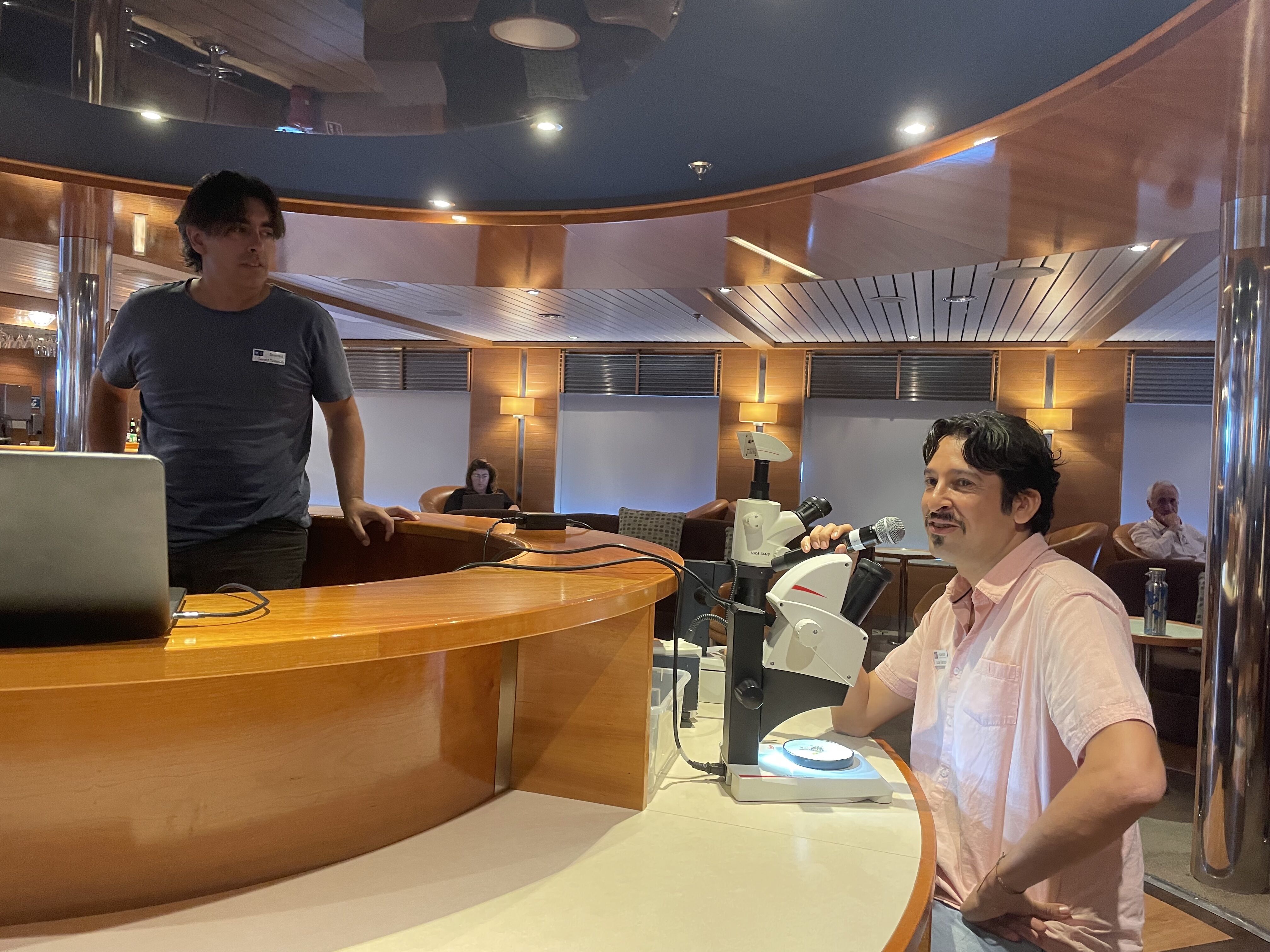 Until today, our trip had not encountered deep oceanic waters despite having sailed over 1000 nautical miles across open sea since leaving Vietnam. Knowing we would cross deep waters this morning, a few of us got out on deck eagerly to enjoy a delightful sunrise in very calm conditions. Flat, calm seas allowed for great viewing opportunities. Glassy waters are perfect for marine mammal spotting, and interesting cetacean data was consequently collected by our on-board guest scientists all day. Various seabird species appeared, and many followed us throughout the day, providing great sightings and photographic opportunities.