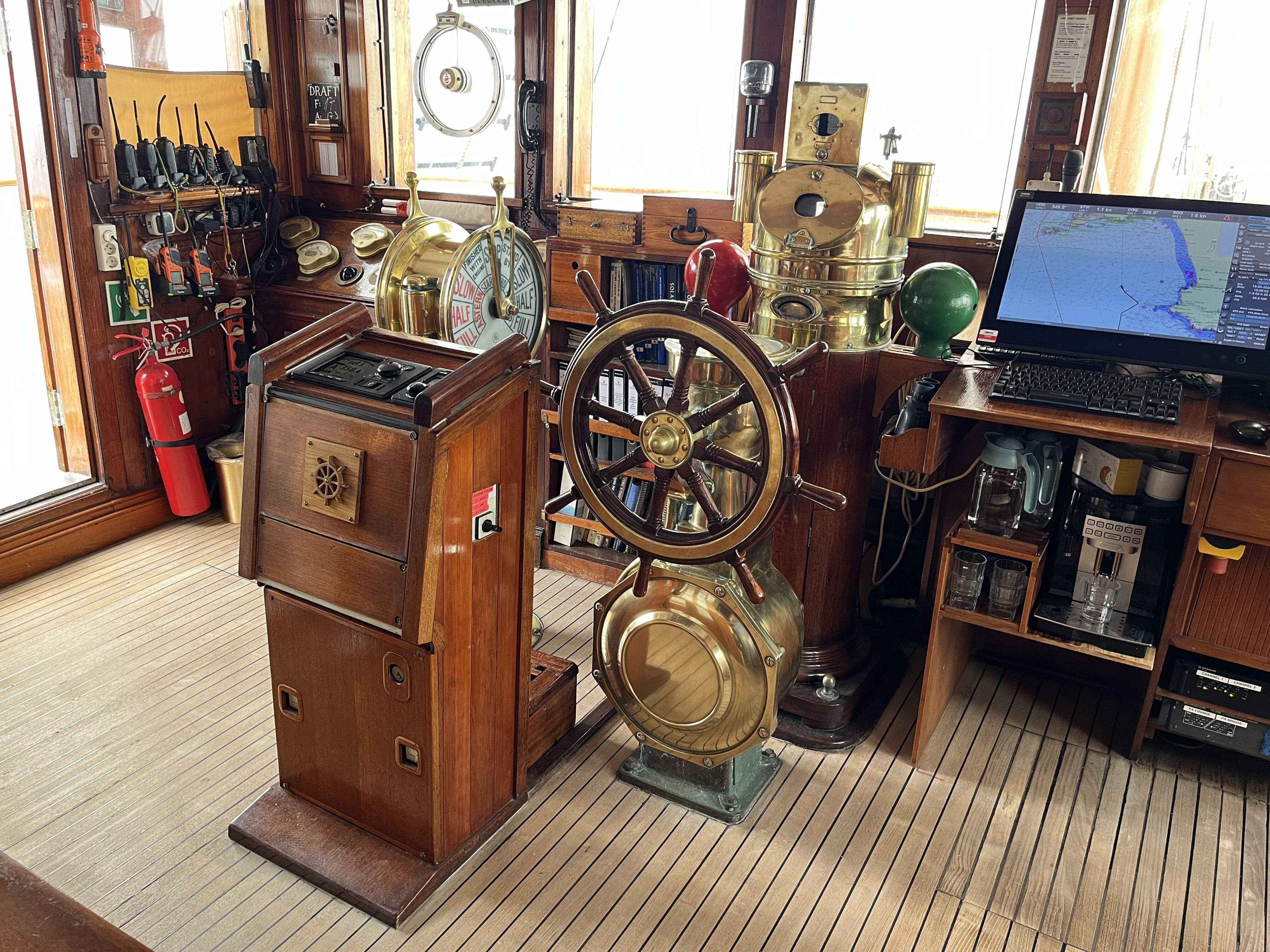 The sea was glass-calm this morning. The sailors went aloft, and we were at full sail by 10AM. Just after the justifiably famous Sea Cloud pasta wheel lunch, a strong squally developed on the starboard side with strong winds and heavy intermittent rain blowing perfectly from the east. We all rushed out to the spanker deck as our sails were billowing, filled with wind. We went from 2 knots per hour in minutes to 7.2 knots. It was exhilarating and we all reveled in the fact that we were at sea in a ship designed for such weather.