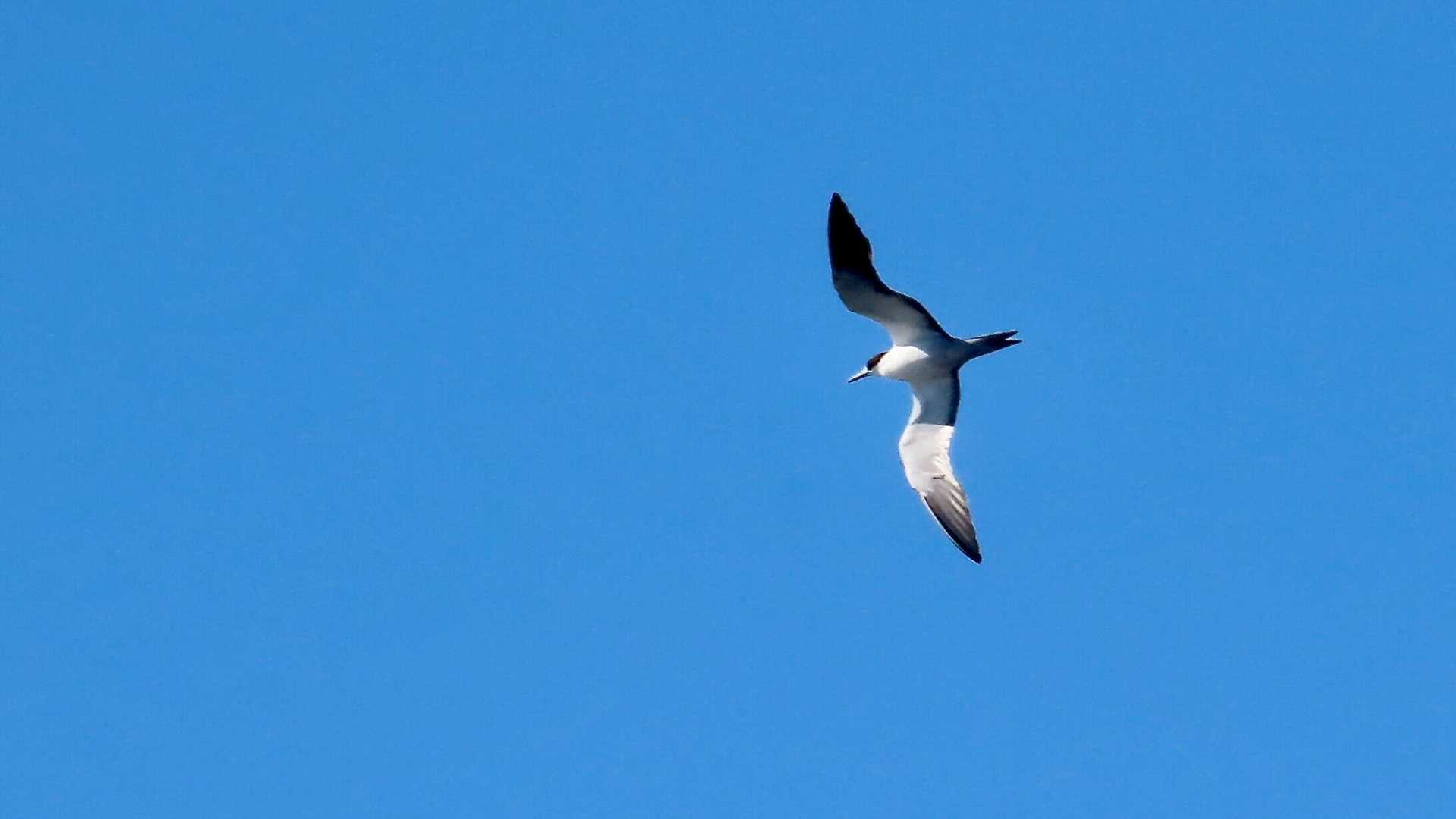Our watchfulness was rewarded with many sightings of sooty terns and brown boobies, as well as the less common masked and red-footed boobies, bridled terns, and lesser frigatebirds. Flying fish kept us entertained with their amazingly long flights over the gently rolling waves. In the afternoon, a mother and calf humpback pair gave us a thrilling show.