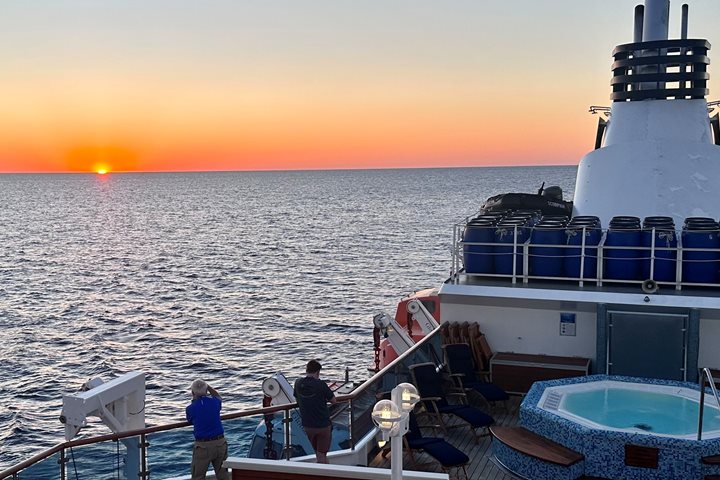 Dawn found National Geographic Orion sailing northwest from the Kimberley Coast toward Ashmore Reef Marine Park, part of the Australian External Territory of Ashmore and Cartier Island. The park is 630 kilometers north of Broome and only 111 kilometers south of the Indonesian island of Roti. The diversion was a navigational requirement of the Australian government, and it provided us with a relaxing day at sea with opportunities for observing seabirds and marine mammals.