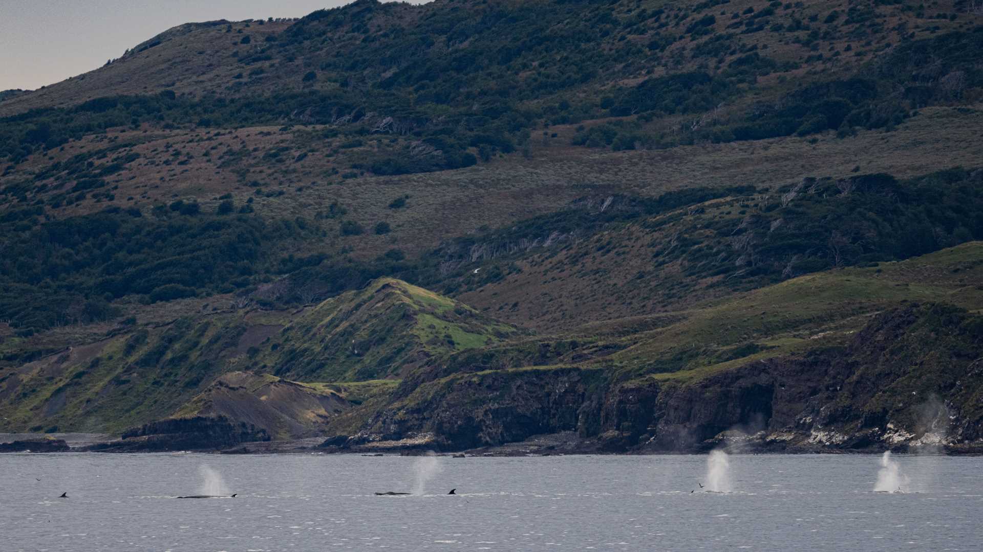 Land-ho! Mid-morning we had land in sight, South America was appearing on the horizon. Upon entering the Beagle Channel, we saw possibly a hundred sei whales. While the seabirds were waiting for the wind on the surface, the whales were feeding a short distance from the ship. As our vessel waited for the pilot to arrive, we could still see whale blows in the distance.