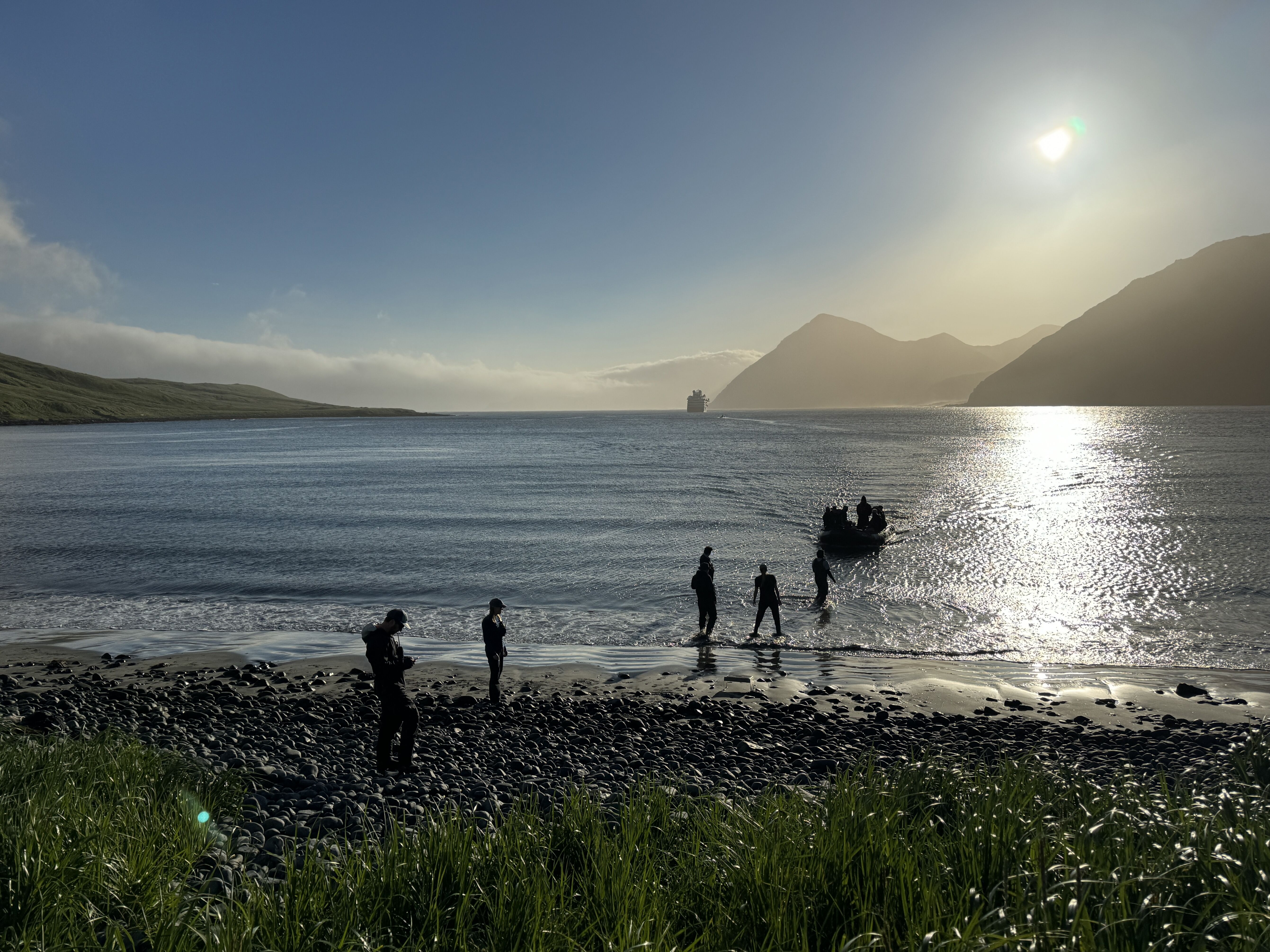 During a perfectly timed BBQ lunch on deck in the rare sunshine of the Aleutians, we repositioned to Wall Bay, a true expedition stop, a place where no one on board had ever been before. Some of us kayaked and some went for a walk among the reindeer and the bald eagles.