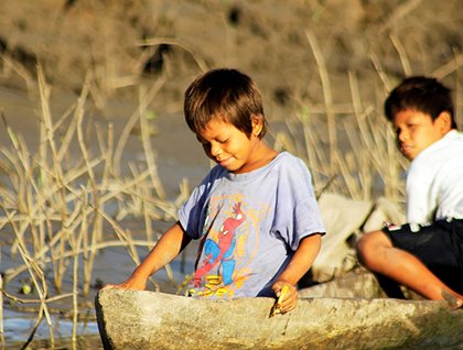 The expedition continued today with a skiff ride exploration of an oxbow lake known as Atun Poza. We even had the chance to meet a local fisherman who gently showed us the first catch of the day. The icing of the cake was, for many of our guests, the experience to have breakfast outdoors aboard the skiffs! We had our first meal of the day served in the most fashionable way, white gloves on our bartender’s hands, fabric napkins in our laps, and even handicraft dolls holding the napkins were included. As a background we had the green surroundings and a concert of tropical sounds as companions all while being covered with the rain forest. On our return trip we paid a short visit to the small village that holds the same name as the lake, Atun Poza Village. As the whole area is in very shallow waters at this time of the year, many villagers were involved in fishing activities.