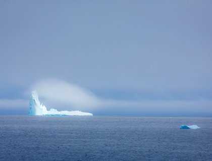 Alternating periods of great visibility with flat calm seas, and foggy bouts, were the course of the day, but much of the morning we were able to see a reasonable distance, and whilst checking out some beautiful icebergs, we also started to sea our first pack ice. The pack ice was sparse, but the birds were not. All morning we encountered a lot of small flocks of little auks or dovekies, bobbing around on the water’s surface, often diving to flee from the approaching ship, or sometimes taking flight. With so many of these birds around, it was clear that their favored food—copepods, a small planktonic crustacean—was also in abundance. We wishfully searched for larger plankton eaters…
