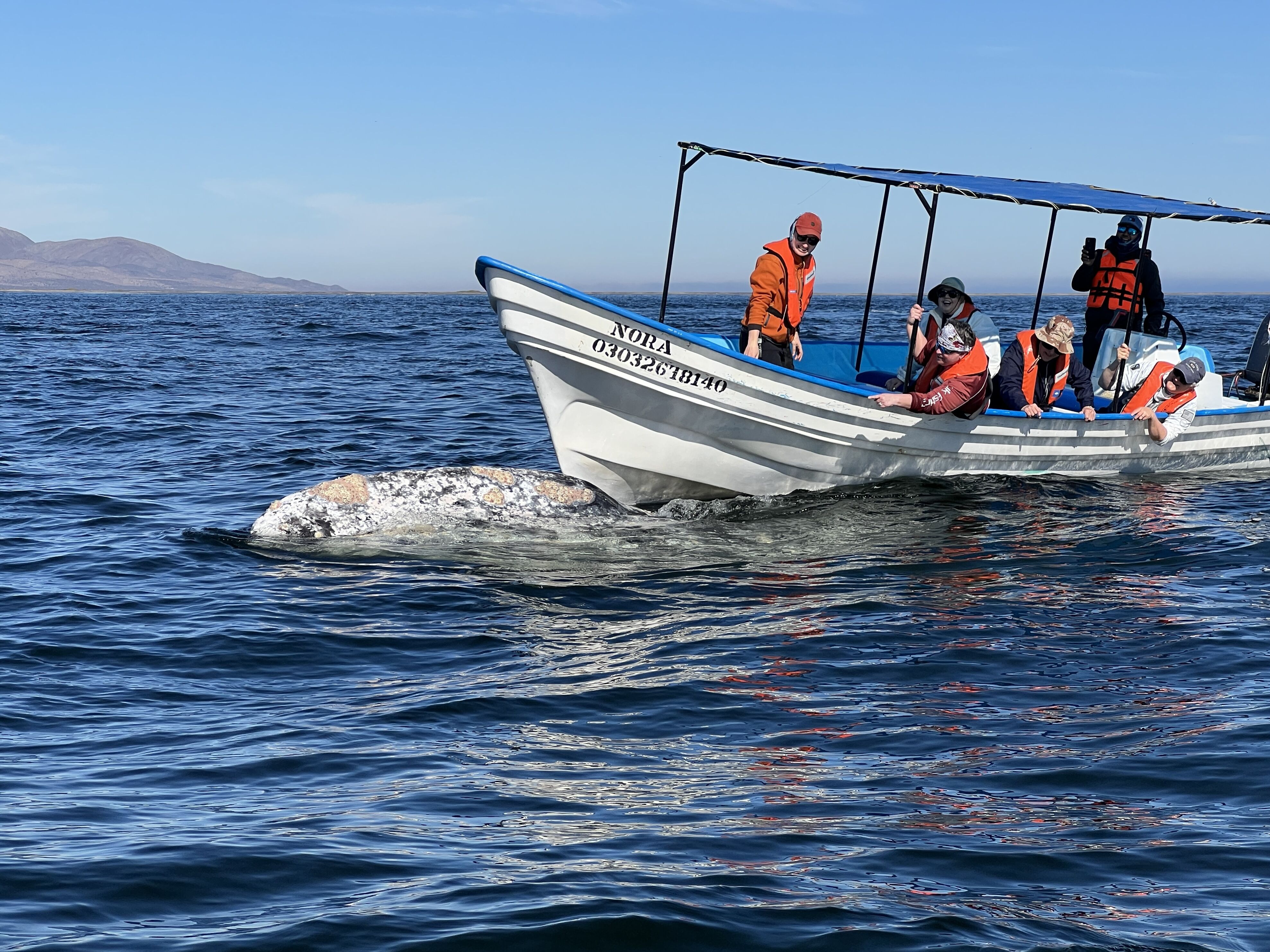What can I say about today? Magical . . . unforgettable . . . spectacular . . . “whale soup”. We went out in pangas in the morning and again in the afternoon, seeking gray whales in Bahia Almejas. With ideal conditions, calm wind and water, we were rewarded with excellent views of gray whale blows, backs, heads, and flukes as they rolled at the surface, took breaths, and occasionally came close to our pangas. They spy hopped (lifted their heads vertically out of the water) and swam slowly.