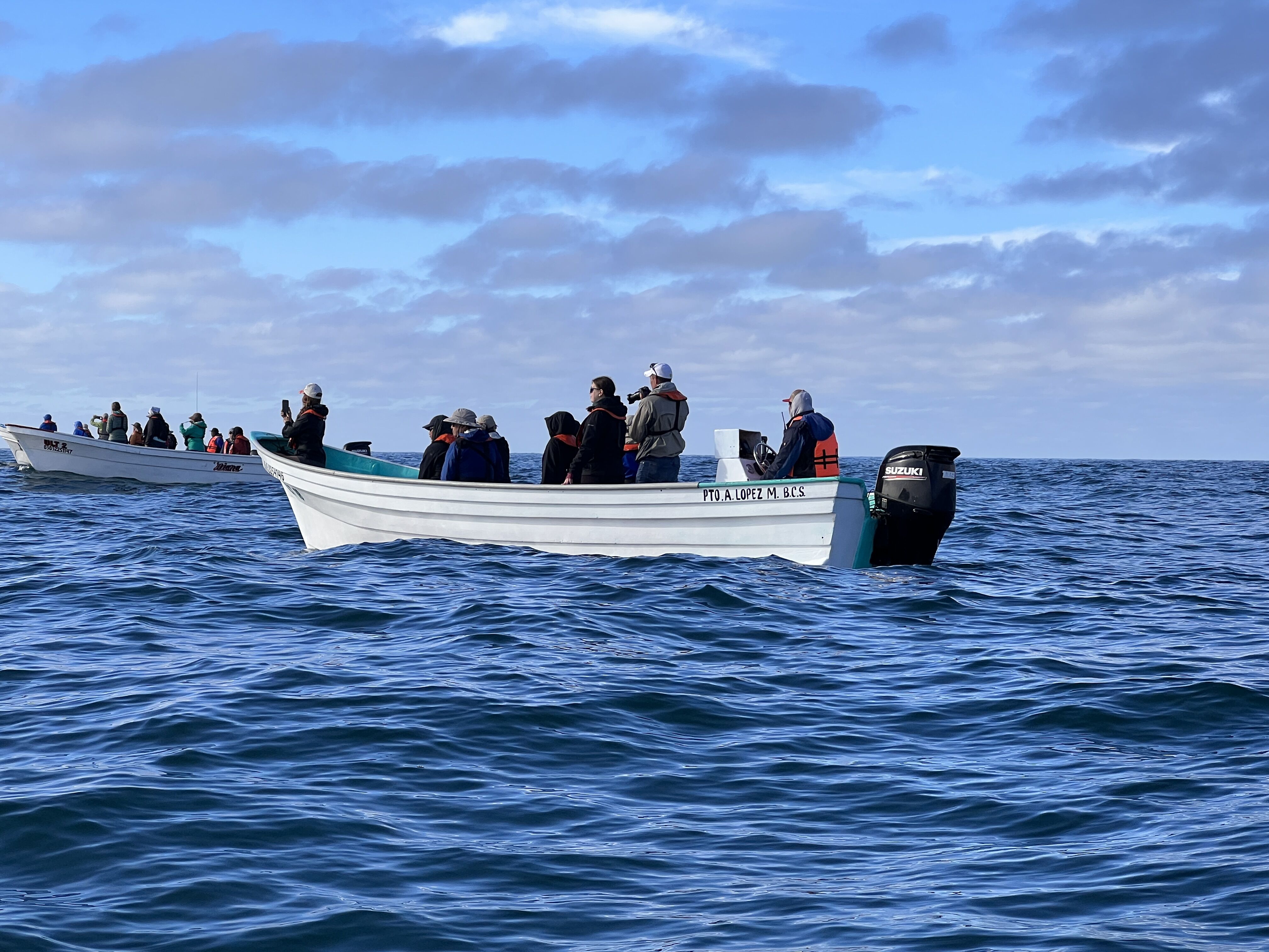 We zoomed out toward the mouth of Bahia Almejas in the speedy pangas, getting great sightings of hundreds of birds congregating on the sand bars. And then, a spout! And another, and another! A dozen or more whales dotted the horizon in every direction. The whales were unusually active. While full body breaches are usually a rare occurrence in this species, we saw multiple breaches from multiple animals throughout the morning. All in all, it was a beautiful introduction to these animals that we hope to know better as the trip continues.