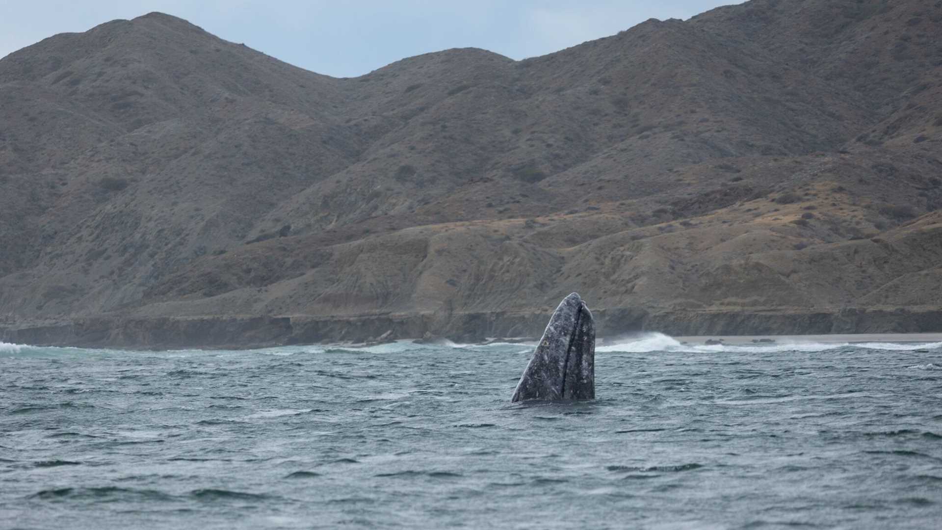 Roughly 40 gray whales rolled through the surf in Bahia Almejas. The animals performed repeated spy-hops, lifting their rostrums out of the water and in full view of our eyes and cameras. By the mid-afternoon the breeze had died down and a pleasant light rain came over the desert. The whales, already wet, were just as delighted with the precipitation as we were - splashing our guests with their flukes as they surfaced mere feet off the boat.