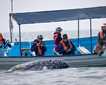 Today the passengers of National Geographic Sea Bird awoke in the northern, narrow part of Bahia Magdalena to an announcement of a gray whale mom and calf pair resting right off our bow; this set the tone for the rest of our day. Our local panga drivers hail from the nearby town of Lopez Mateos. They drove us out into one of the most important nursery grounds for these gray whales where we had an experience that was beyond amazing. A good portion of our guests had the very special honor of interacting with a friendly mom/calf pair, getting to touch and some getting to kiss a sweet baby whale. This cute little calf did the rounds, going from boat to boat and allowing guests to give some scratches and love. It was a life changing experience for both our guests and naturalists, as well as a great moment of reflection on the incredible transformation these whales have gone through from “devil fish” to the “friendly whale.” After a full day of whale watching, we ended our night enjoying cocktails on the beach with a full charcuterie board and s’mores. We watched a beautiful sunset and acted like kids, leaping off the sand dunes as whales continued to swim along the nearby shore.