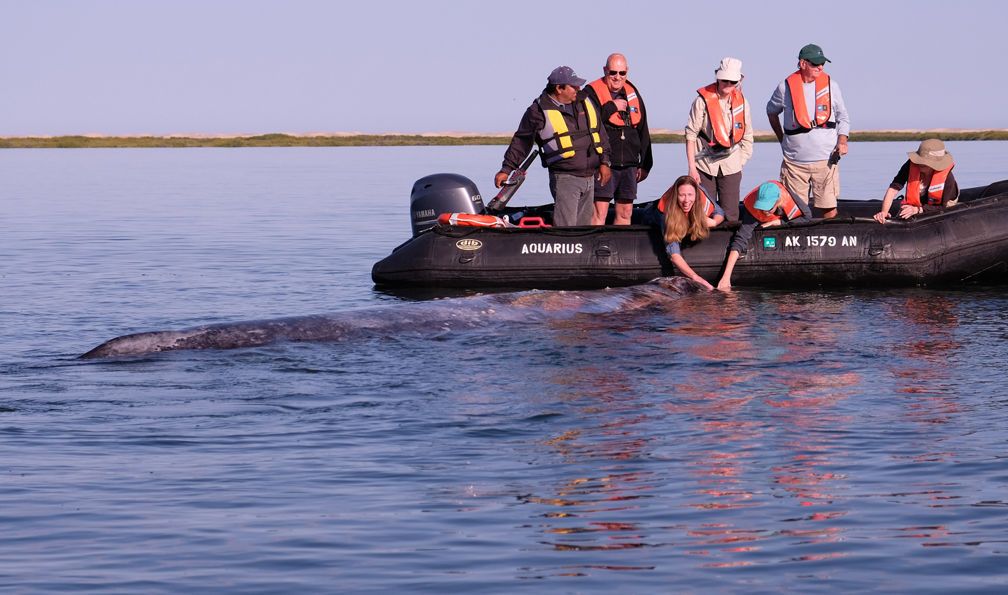 Today we woke with the shining stars and took Zodiacs ashore to meet our coaches for a trip to Chale, a small town on the shores of Magdalena Bay. The goal was to find some wintering gray whales, magnificent leviathans which frequent this coast to give birth before the long migration back to their Arctic feeding grounds. These whales did not disappoint! Spyhopping, breaching, and even a bit of tail flukes. As a result, there were lots of smiles and laughter all around! We returned to the town for lunch and then headed back out on the local boats for a second round. As we returned to the ship, the sun set over La Paz, with glassy waters of gold in the harbor, and pink clouds above. The constellations of Orion, Taurus, and the Pleiades shone over our Zodiacs on our way back to dinner aboard National Geographic Venture .
