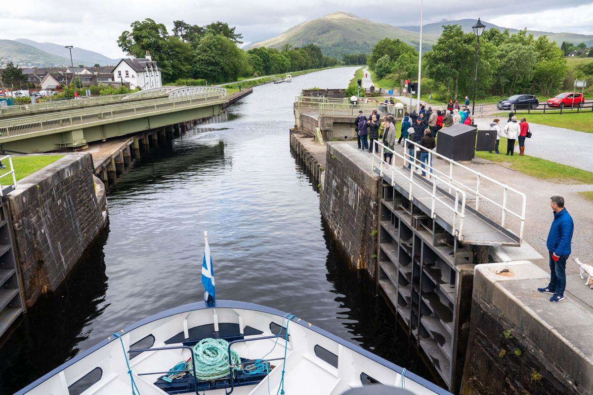 This morning we completed our traverse of the Caledonian Canal, beginning with the descent of Neptune’s Staircase. The staircase is a series of eight locks that lower the ship 19 meters (62 feet) over a quarter of a mile. After passing through swinging bridges, we paused in the small village of Corpach to wait for the tides to reach an optimal level for our exit from the canal. This gave us the opportunity to walk the tow path and enjoy the morning bits of sunshine.