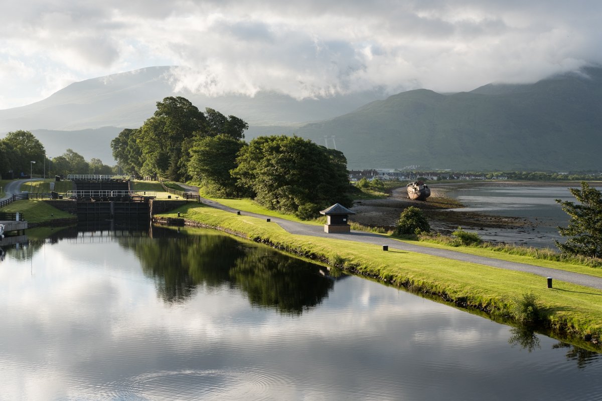 Today we began our two-day journey up the Caledonian Canal to Inverness. Our morning started with a climb up Neptune’s Staircase, a series of eight locks that took us into a stretch of the canal between the sea and Loch Lochy. Ben Nevis towered above, the highest mountain in the UK. Cloud and mist shrouded the summit, making the peak look like a mighty massif.