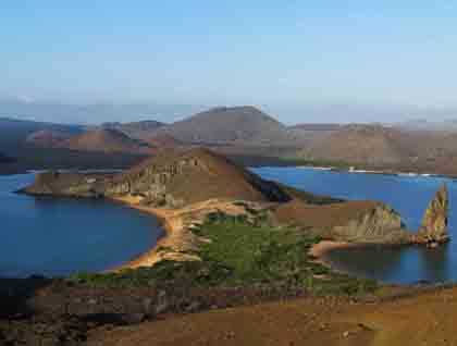 Just before breakfast, early in the morning, the activities started with Bartolome Island. It was formed by some explosive volcanic eruptions that turned the magma into ash and cinder. Later, after age began doing its job eroding the tuff cones, the famous Pinnacle Rock was formed. We used the stairs built to help the visitors climb the island to enjoy the amazing landscape on top. Later there were some more options like walking along a sea turtle nesting beach and learning a little more about their ecosystem or snorkeling. The second option offered many kinds of tropical fish, stars and white tipped sharks, and even an elusive Galapagos penguin.