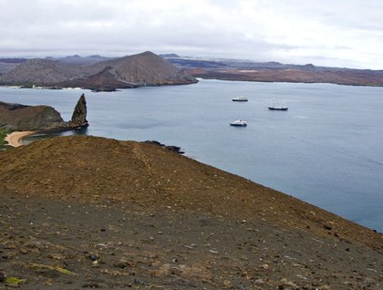 Our pre-breakfast outing this morning was fantastic. We hiked to the summit of Bartolome Island, a tiny little island full of geological wonders. Named after Bartholomew Sullivan, the 2nd Lieutenant on board the Beagle, Bartolome is the perfect site to explain the geological origin of the islands and the arrival of colonization and of species over thousands or even millions of years. Lichens and pioneer plants such as lava cactus and the endemic “tiquilia nesiotica” are the organisms that cause the bio-erosion of the lava, converting it into soil where other less-adapted species will be able to survive.