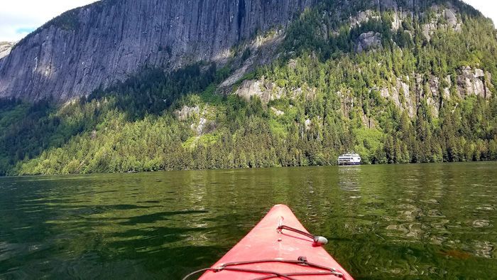 After sailing from Haida Gwaii, we reentered U.S. waters and arrived at the northern boundary of Dixon Entrance. The mist and clouds from the day before were gone and we were treated to sunshine on the water as we began our journey in Southeast Alaska. We soon spotted a solitary humpback whale feeding near the shore of a small cove. The whale surface fed for a while, then began slapping its tail on the surface. Some speculate that this is a learned behavior that possibly stuns the whale’s fish prey. After having our fill of the whale, we continued east into Behm Canal, through Owl Pass and the cliff face that gives the pass its name, and into the heart of Misty Fjords National Monument. We set anchor at the head of the canal and spent the afternoon kayaking the quiet bay and shoreline. While guests relaxed on deck with drinks and hors d’oeuvres before dinner, a few staff headed out by expedition landing craft to deploy the remote-operated vehicle into the sea below the Owl Pass rock face.