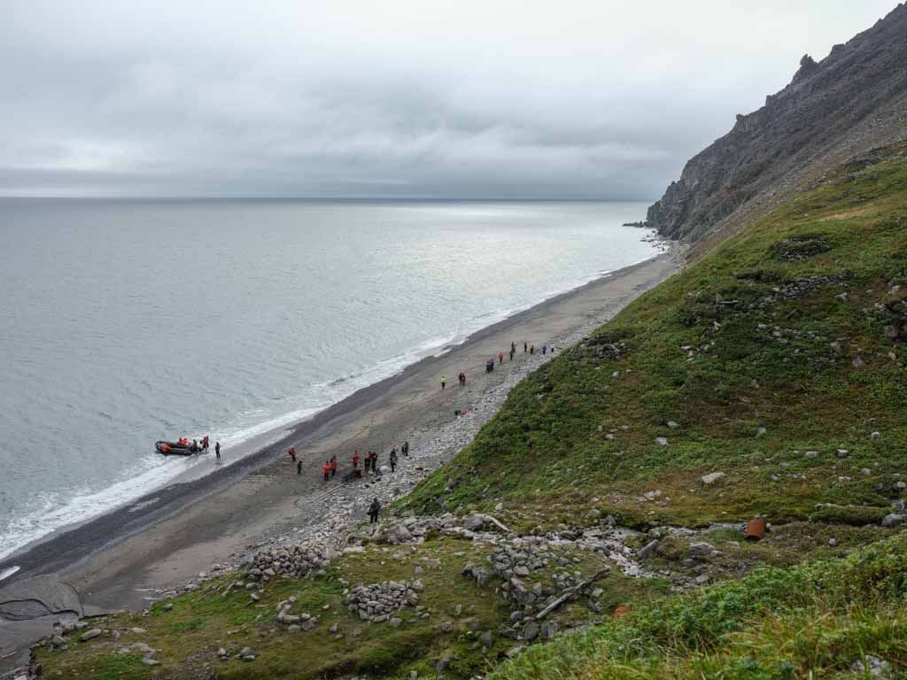 Lunch was earlier, to accommodate our afternoon landing at Cape Dezhnev, the easternmost point on the planet. The Zodiacs quickly got us ashore, the landing a little challenging in the surf, but with staff aid we were soon securely ashore. The main point of interest here is the Yupik village of Naukan which was forcibly abandoned in 1958 during the Soviet era. It is a remarkable spot and the history is palpable. It was inhabited by the Yupik people who were coastal marine mammal hunters. A nearby stream provides fresh water, the main structures from surrounding rock, with the remainder of building materials from whales, walrus, and seals.