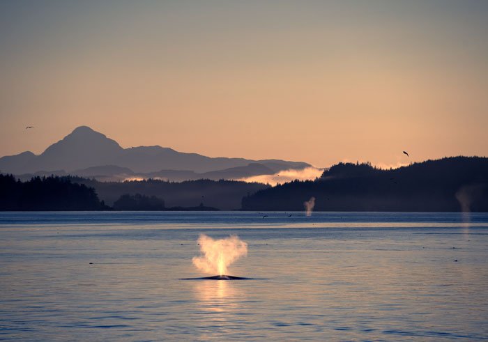 The constellation Orion was still visible in the sky as National Geographic Sea Bird entered Black Fish Sound, a body of water that runs along the mainland of British Columbia inside Johnstone Strait. The sun began rising in the east just after 8 a.m. on another clear, fall day. Looking all around National Geographic Sea Bird in every direction one could spot humpback whales. The air wasfilled with the sound of common murres who landed on the sea around our ship and then dove rapidly out of the way. All kinds of wildlife were feeding in the rich waters of this sound. The humpbacks were lunging across the surface, taking in huge gulps of water and small fish. The murres were catching the same small fish one at a time. To add to the experience, the long shadows of fall light were gorgeous! Backlit whale blows, diving birds, and distant mountains all showed off the beauty of this place.