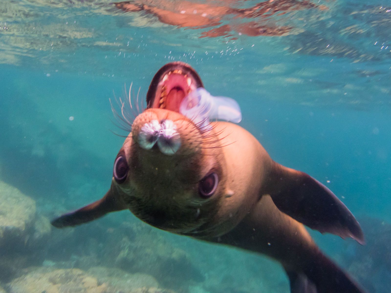 Today was yet again a fabulous Antarctic day marked by stunning blue-sky weather, plenty of penguins, and an exciting range of marine life. After breakfast, we zipped to shore at Brown Bluff, a fascinating geologic area where we found hundreds of penguins. This is a colony which supported 100,000 pairs of Adelie penguins earlier in the season, but is now reaching the season's end. There were a handful of Adelie chicks and many gentoo chicks testing the waters and exercising their wings. The beach shallows were kiddy pools filled with fluffy chicks sticking their heads into the water, wading in, and being pushed around by small incoming waves. We enjoyed watching their antics for a couple of hours, as well as finding a solitary fur seal, and taking a hike onto the edge of a glacier.