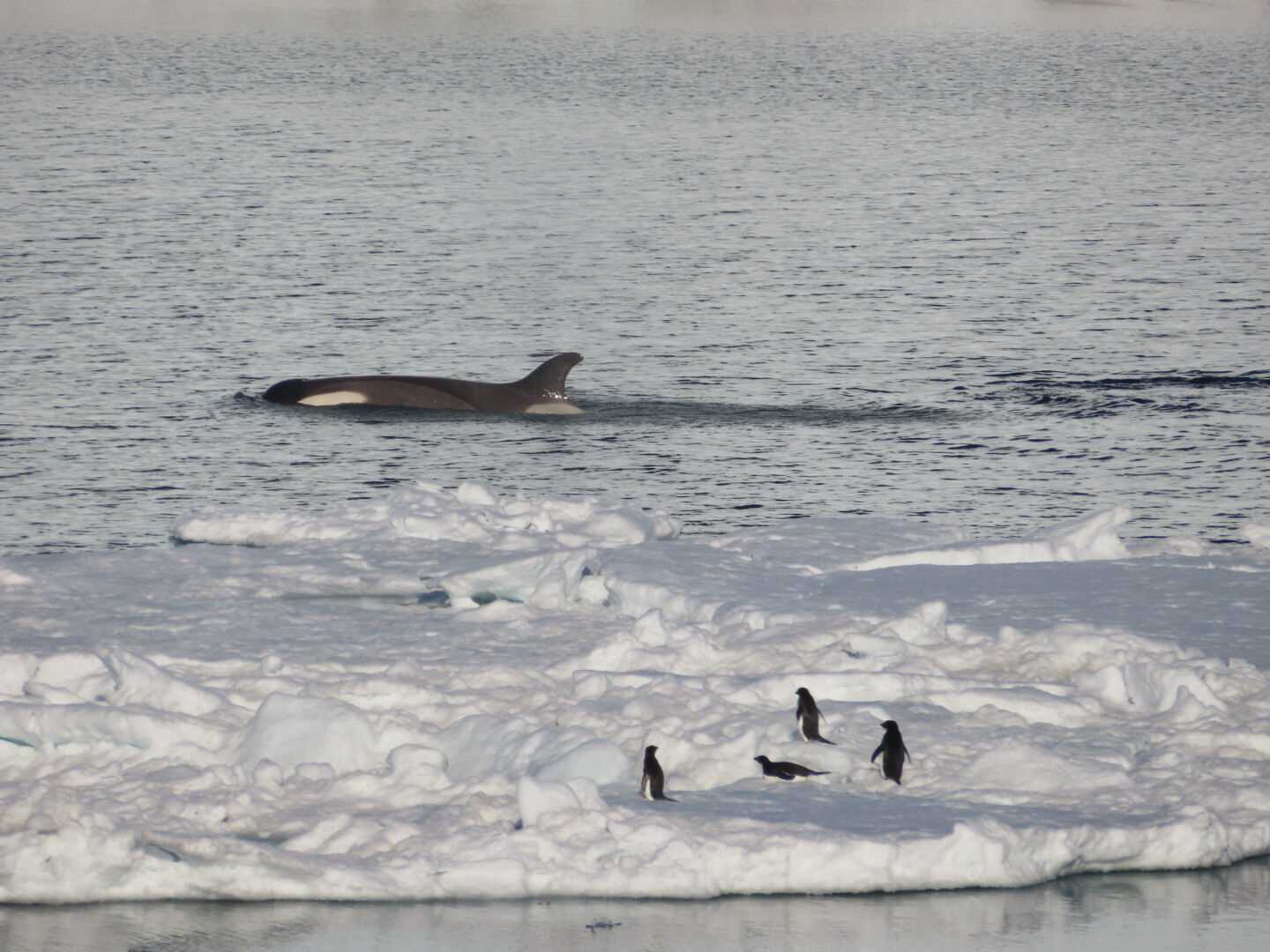 Barely had we departed the bergs than a pod of orcas passed by, and we watched them as they skirted the edge of A80A, searching for food. Finally, as we arrived at the ice sheet off Snow Hill Island, we glimpsed emperor penguins, raising our hopes for tomorrow’s exploration.