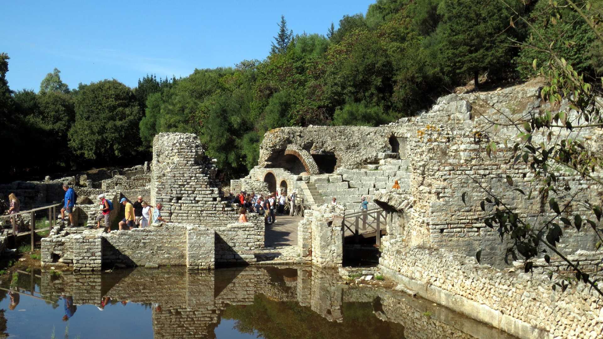 We arrived in the port city of Sarande to begin our two-day visit of Albania. We first traveled by bus to Butrint, traversing an intriguing landscape of beachside hotels, half-finished houses, Communist-era bunkers, and cultivated fields. Once at the National Park of Butrint, we toured the archaeological site along forested paths, taking in the complex mix of material dating from the Hellenistic to Ottoman eras. The weather was perfect, and the rain from the previous evening left behind shallow pools that reflected the site’s ancient ruins and lush vegetation.
