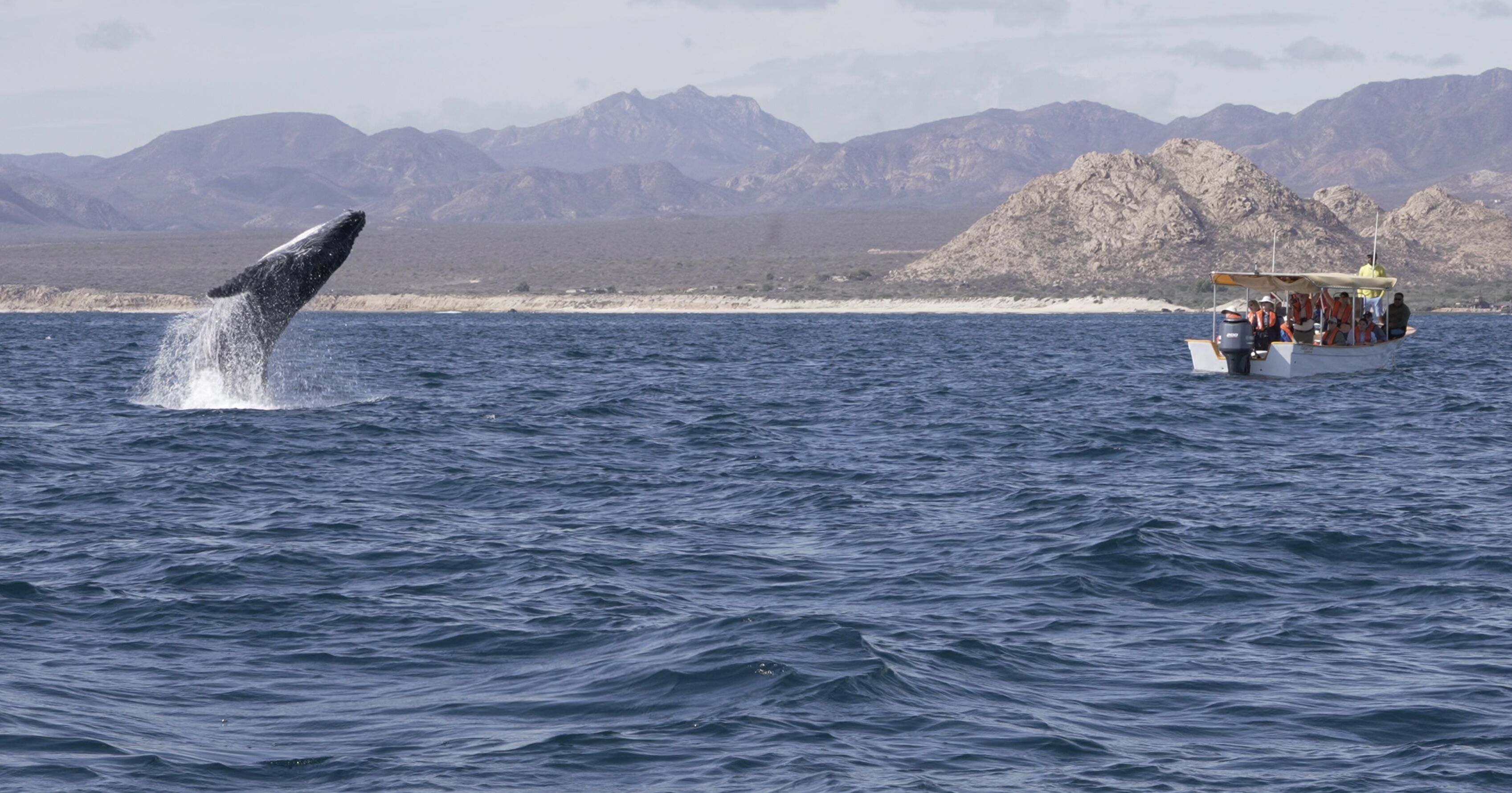 It the afternoon, we set sail south to begin to make our way around the cape of the Baja Peninsula. We hadn’t even made in through the first course of lunch before we had to slow to watch an amazing show of humpback whales through the large windows. And the show didn’t end for hours. For much of the afternoon, we marveled over the acrobatic activity of endless humpbacks, including a few calves. We observed breaching, tail slapping, fin slapping, and blows galore. It was truly one of the best shows most of us have ever seen. We were even able to hear some humpback singing with the hydrophone deployed off the bow. As evening drew near, we continued our transit south with a beautiful sunset made more dramatic by some rare winter rain clouds over the peninsula.