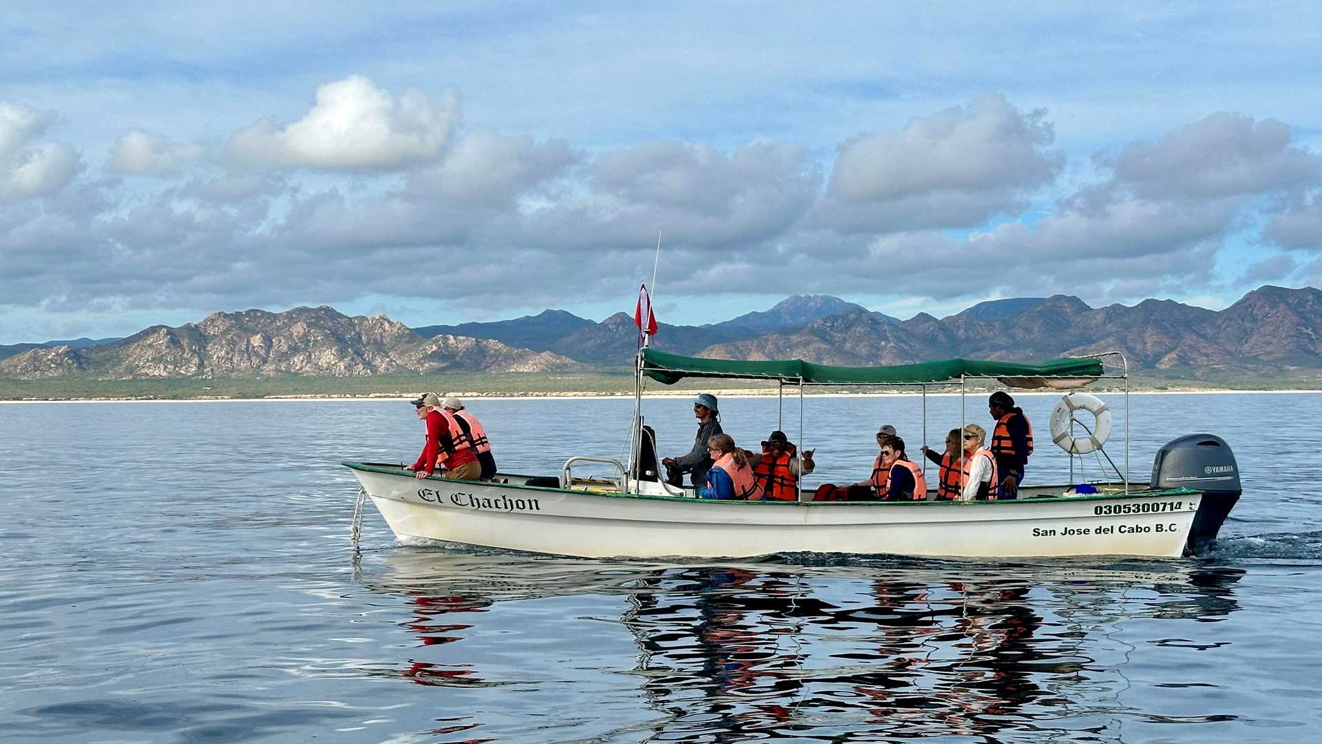 Today we had an exciting start to the day; we enjoyed a beautiful sunrise from the bow of National Geographic Venture, while we entered the protected waters of Cabo Pulmo National Park. Humpback whales and mobula rays greeted us by jumping out of the water. We boarded park-operated pangas and spent the first half of our day looking for close encounters with whales. Cabo Pulmo delivered — we had an amazing time watching humpbacks breach repeatedly.