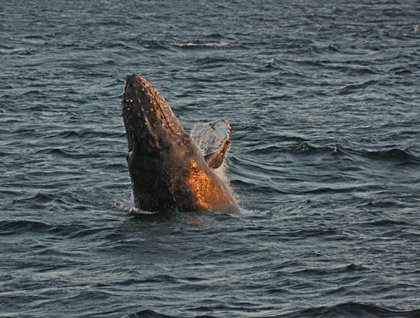 We eventually reached “La Boca,” the mouth of the bay, that space between the southernmost point of Isla Magdalena and the northernmost point of Isla Margarita, and headed out to the open Pacific. Here we saw a few gray whales, but we kept going west, then south, to our expected arrival point tomorrow morning, the end of the land, or “Finisterra.” But, oh luck of ours, we then met a lonely humpback whale, probably a young male, who really showed off to us, very near our ship, with a good series of breaches! We watched it for a while, till it began to get too dark to see well. Tomorrow we will definitely see other humpbacks near San Jose del Cabo, at the famous “Gorda Banks.”