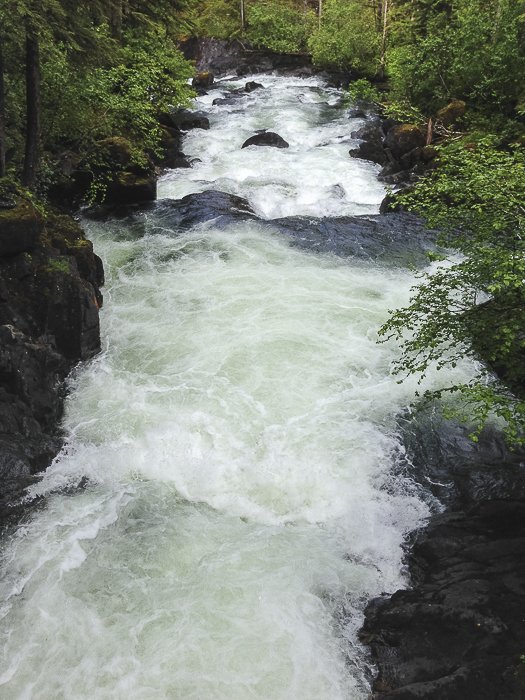 Today began with misty skies and low clouds hanging over the peaks as we continued to sail towards our morning destination. The water was calm and pretty with varying patterns on the surface. As we turned into beautiful Thomas Bay, the sun broke through lightly and briefly. We anchored, and after enjoying a delicious and hearty breakfast, we set for shore in the expedition landing crafts to hike along Cascade Creek, a wonderful cascade of water that rushes downhill through the lush and green temperate rainforest.