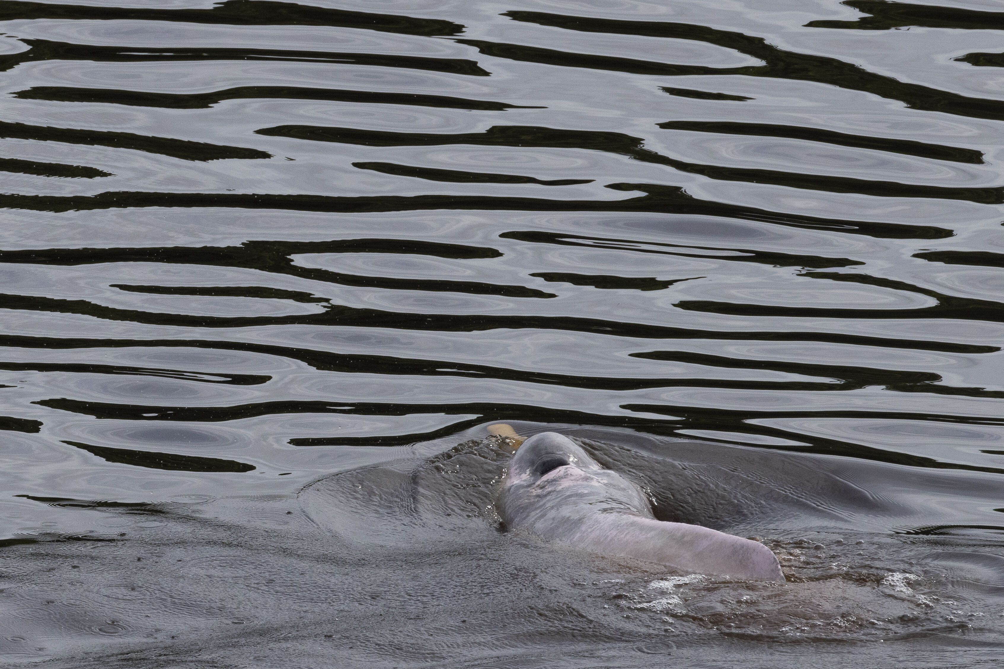 We continued our navigation through the Marañón River and arrived at the mouth of the Yanayacu-Pucate basin around lunchtime. There, the sediment-loaded white waters of the Marañón mix with the tannin-rich water of the Yanayacu-Pucate, which attracts a lot of dolphins. We had the pleasure of watching two species of river dolphins (the larger pink and smaller grey ones) all afternoon. Even during lunch, we enjoyed watching the dolphins from the dining room! Several times, individuals jumped out of the water to regale us with uncommon full-body views. Others chased fish, and one pink dolphin even played with a stick in its mouth.
