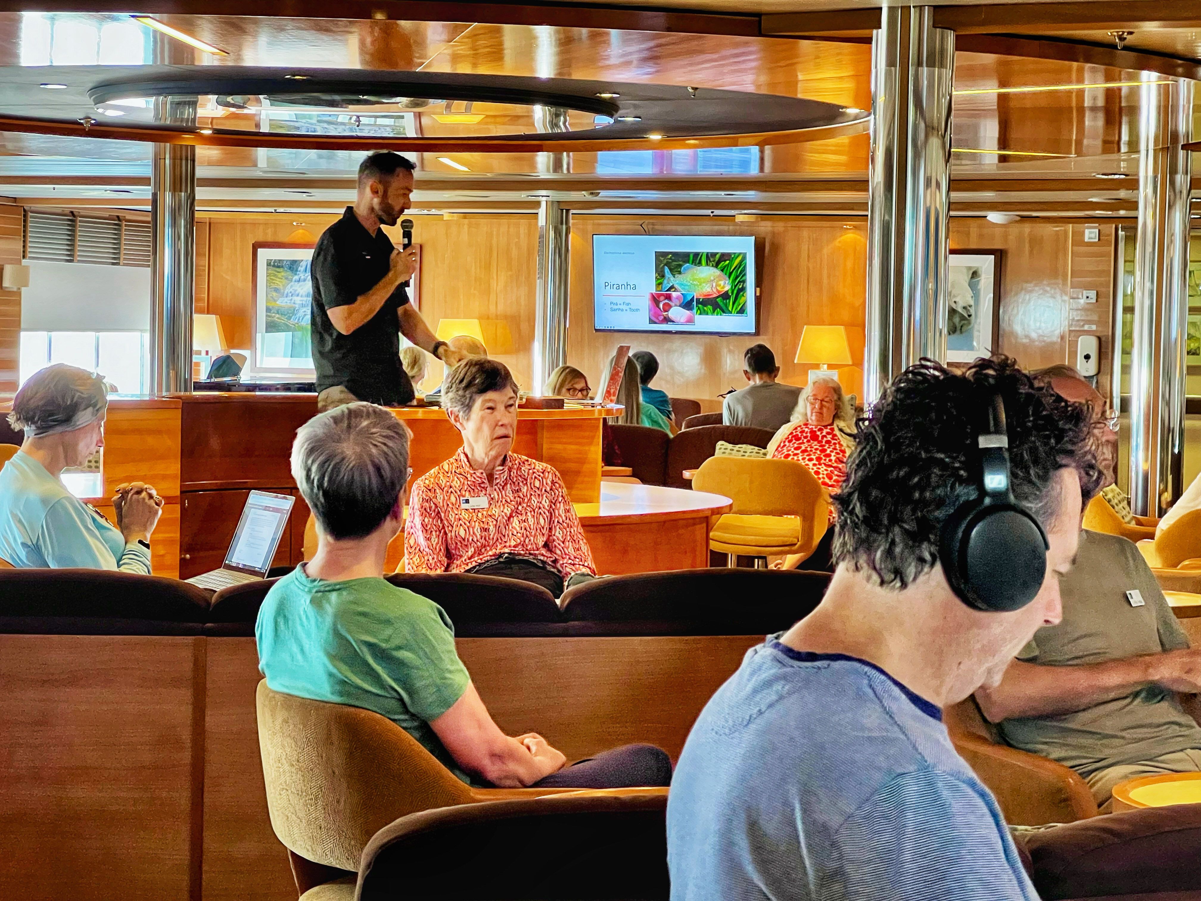 Not far from Cerro Dragon, we encountered a shoreline covered by mangroves, which offer shelter to animals. Turtles, rays, and sharks can feed, grow, and develop here. Additionally, birds such as boobies, pelicans, and herons are abundant along this beautiful coast. The best way to explore is by Zodiac and kayak. Kayaks allow us to enter the coves where abundant mangroves leave just enough room for the kayaks to paddle. It is such a peaceful, calm place!