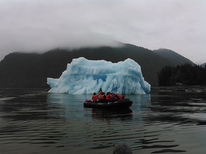 On the last full day of our voyage, we woke in Endicott Arm near the Dawes Glacier. We spent the morning enjoying Zodiac tours to the face of Dawes Glacier and watched multiple calving events. We were also able to spot several harbor seals, waterfalls, and a couple harbor porpoises on the way. After lunch we had the opportunity to participate in a polar plunge. Forty people decided to brave the frigid water for a short swim. Those of us not eager to jump into glacier water were able to watch from the bow. After the polar plunge, we warmed up on board as we started transiting towards Juneau. On the way, we stopped at a beautiful waterfall to once again admire the amazing natural beauty of Alaska. During our farewell recap, we were treated to a quick visit by a humpback whale. We ended our day with a slideshow made up of our favorite photos and memories of an amazing week on board National Geographic Quest .