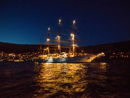 Twelve hours after departing Sitka, the expedition leader’s morning wake-up call was a bit early, because a humpback whale was breaching near the ship! The whale raised its tail flukes, dove, and seconds later burst out of the water, landing with a huge splash. This sequence was repeated again…and again…and again. The setting was beautiful: tall, jagged mountains, spruce-covered hills touching the shore, and a cascading waterfall. But the boisterous young whale kept our attention. It was an absolutely wonderful beginning to our voyage.