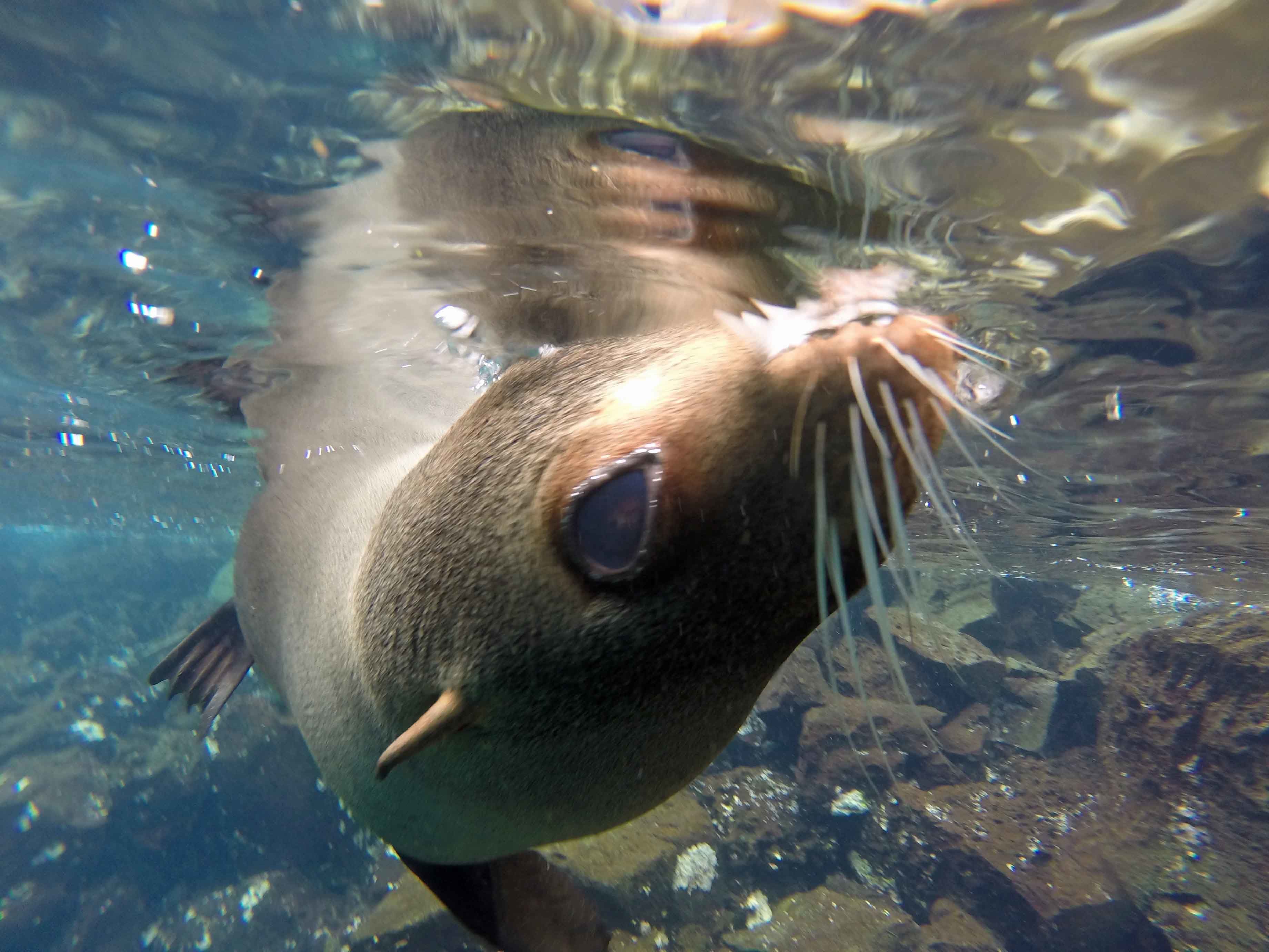 After getting back onboard we got ready for snorkeling. Our aim was to explore beneath the waves of the turquoise channel. We were lucky to encounter the best snorkeling conditions during this expedition with visibility in excess of 30 feet and a comfortable 72°F warm water. The calm waters of the channel where teeming with life. Massive amounts of young fish seemed to hug the shallow shore seeking protection from predators. This might protect them from larger predators, but not from snappers and groupers that slowly moved below only sporadically speeding up to the shallows to attack the tight schools of Black striped salema and anchovies. We even had a Galapagos penguin speed right through and around the group while chasing the small fish. The waters where teeming with life. From the colorful fish in the shallows, to the white tip reef sharks motionlessly resting bellow the ledges the rocky reef, it seemed as alive as a busy city center.