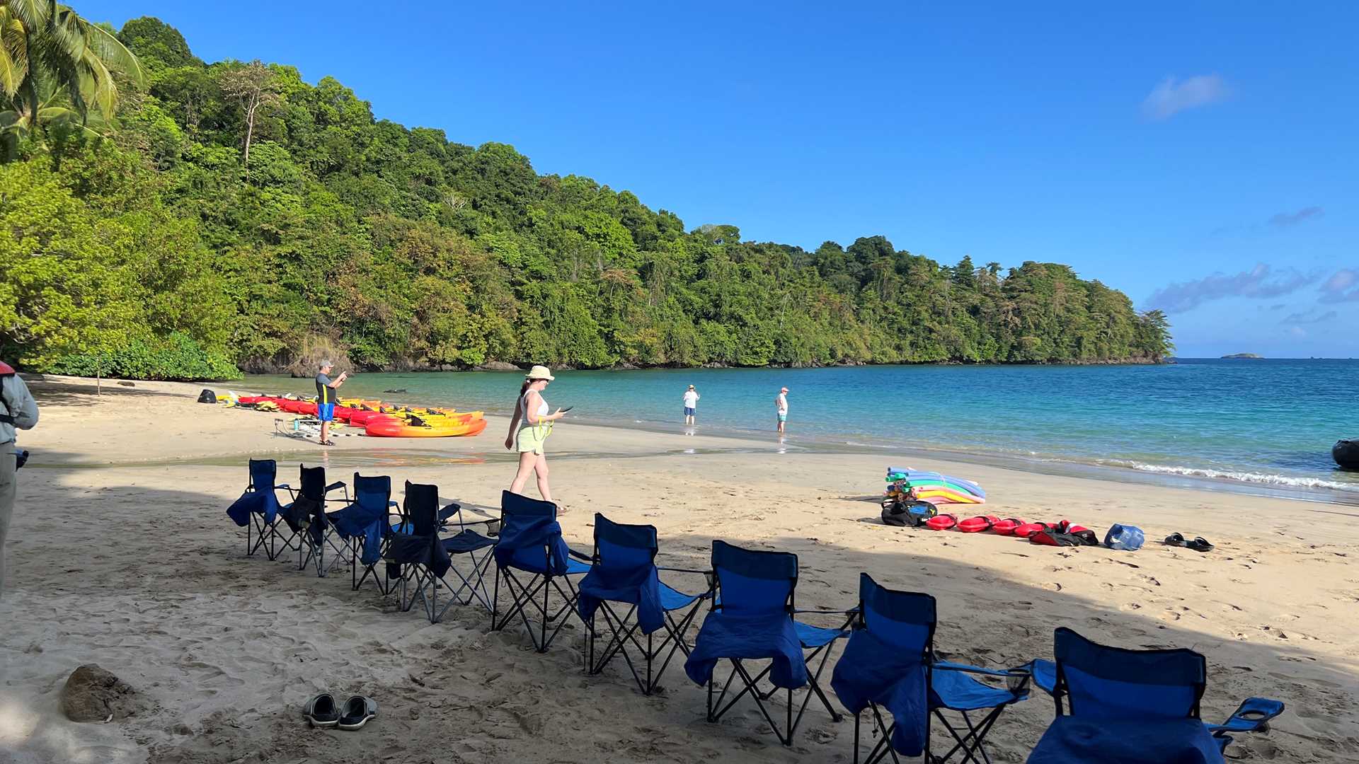 Our ship anchored off Coiba Island, Panama, early in the morning. The sun had just risen, casting a golden light over the dense rainforest. After a wonderful breakfast, we disembarked at the ranger station. Dividing into groups, some of us set off on a guided walk through the jungle, spotting scarlet macaws and other colorful birds in the trees adjacent to the ocean. Others chose to kayak or paddleboard along the mangrove-lined shores, gliding over the calm, clear water.