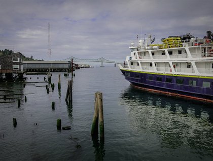 The scale of the Bonneville Dam and power station was surprising, and as we entered the lock chamber behind a tug and barge, National Geographic Sea Bird seemed somehow smaller than before. The lock raised the ship about 90 feet before we docked at the old Cascade Lock.